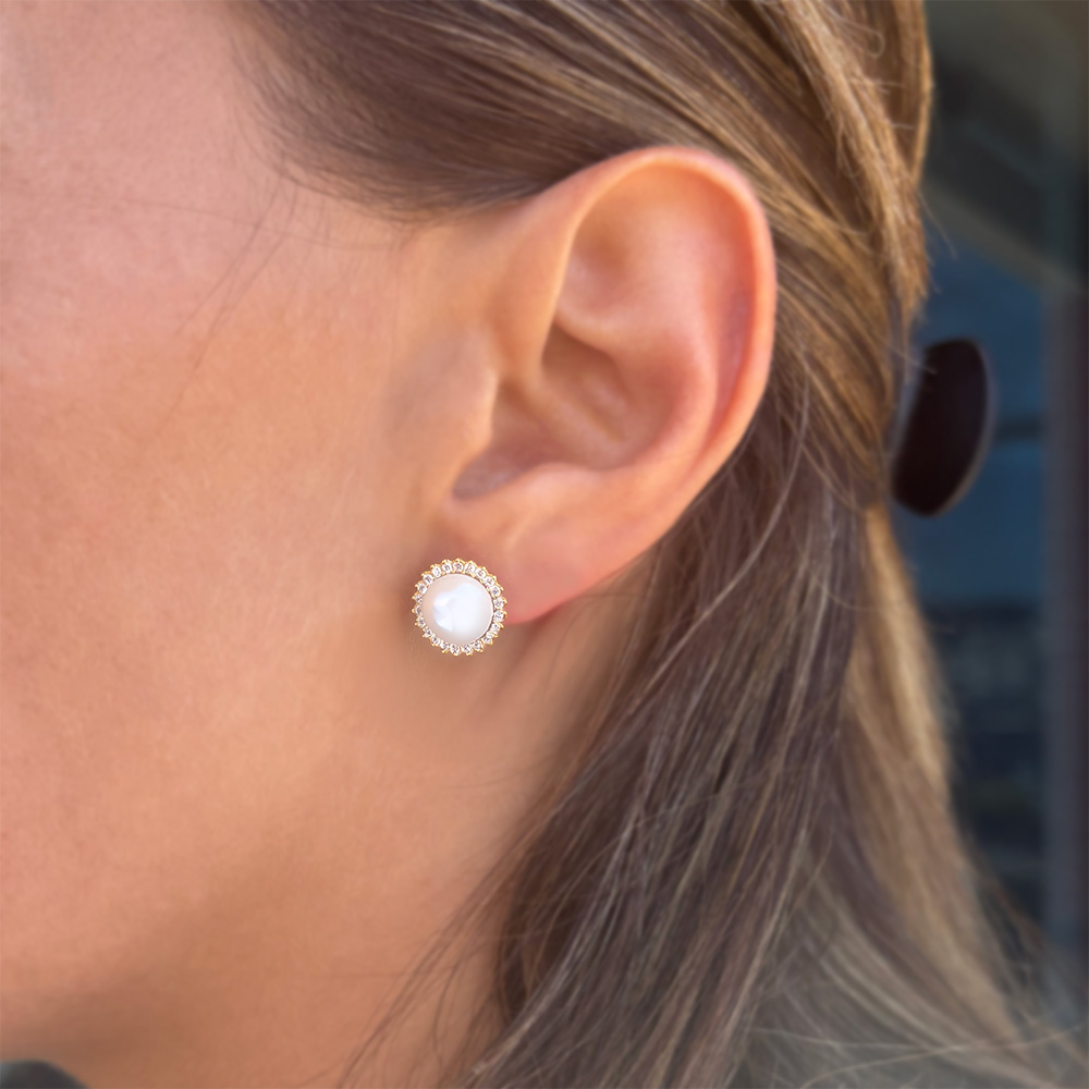 Ένα εντυπωσιακό ζευγάρι σκουλαρίκια που συνδυάζουν την κλασική ομορφιά των μαργαριταριών με τη λάμψη των ζιργκόν.