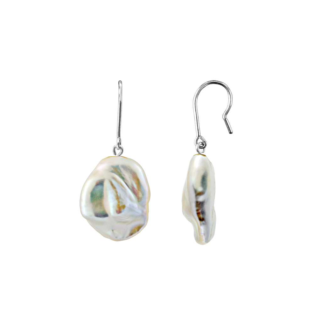 • Ένα φανταστικό ζευγάρι κρεμαστά σκουλαρίκια με 2 εντυπωσιακά λευκά μαργαριτάρια Biwa Fresh Water Pearl, άριστης ποιότητας σε σχήμα Baroque, διαμέτρου 12,5 x 14 χιλιοστών.