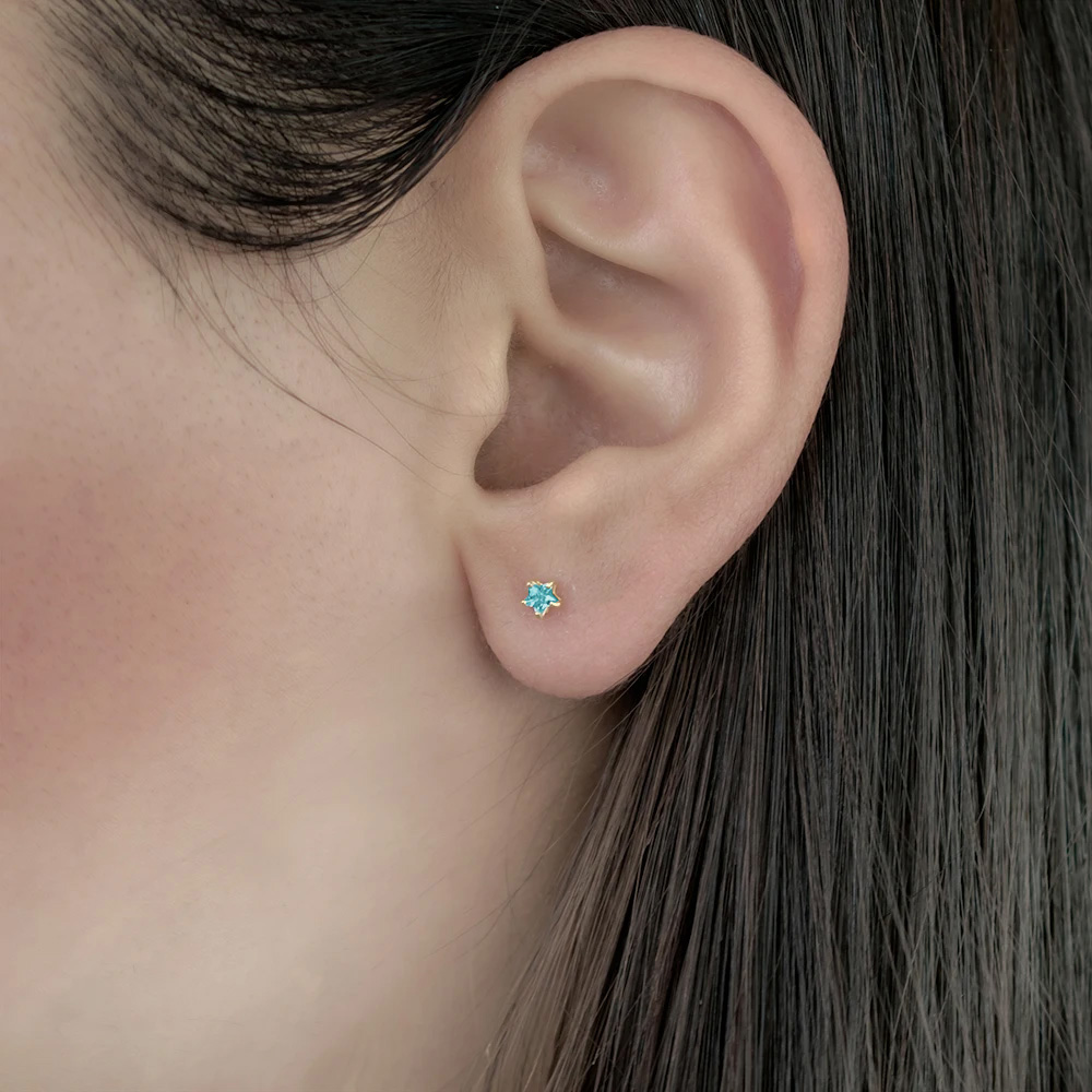 • Ένα εντυπωσιακό μονόπετρο ζευγάρι σκουλαρίκια με  aqua διαμέτρου χιλιοστών, σε σχήμα αστέρι.