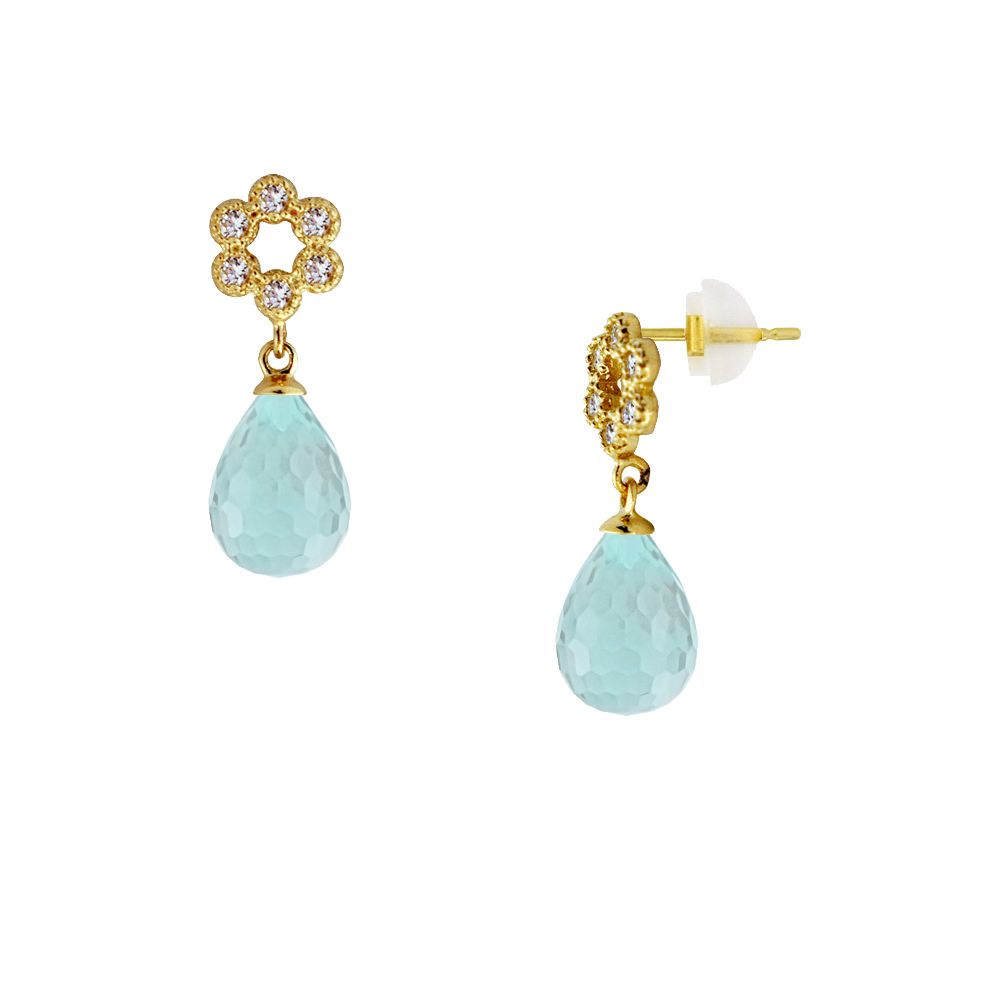 • Ένα φανταστικό ζευγάρι σκουλαρίκια με ημιπολύτιμους λίθους Aqua Cubic Zircon Facet σε σχήμα Drop (σταγόνα), διαμέτρου 7 x 10 χιλιοστών.