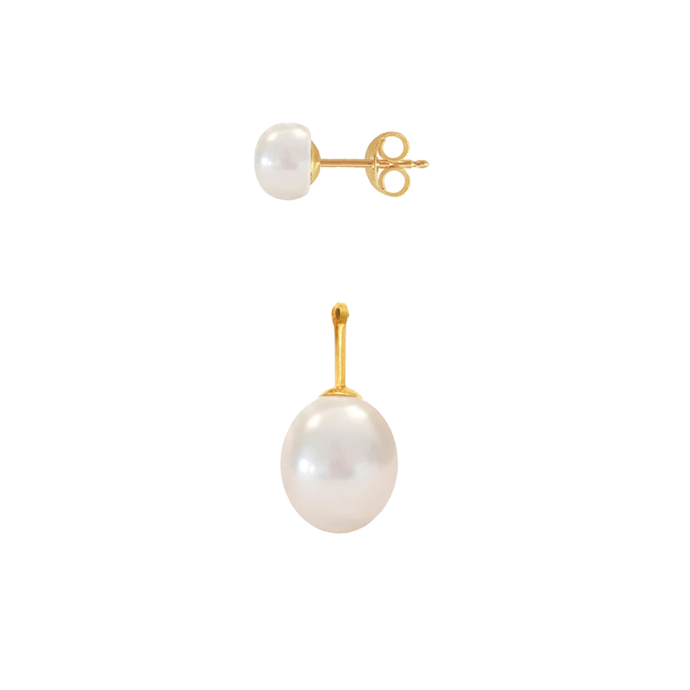 Τα σκουλαρίκια εντυπωσιάζουν με το σχέδιό τους καθώς αποτελούνται από 2 τμήματα. Το ένα τμήμα είναι καρφωτό σκουλαρίκι με λευκά μαργαριτάρια Fresh Water Pearl, άριστης ποιότητας σε σχήμα Button (κουμπί), διαμέτρου 5,5 - 6 χιλιοστών  και το άλλο μία χρυσή βάση 14 καρατίων στην οποία υπάρχει το μαργαριτάρι Fresh Water Pearl διαμέτρου 8,5x11 χιλιοστών σε σχήμα Long, με συνολικό μήκος περίπου 2 εκατοστά.