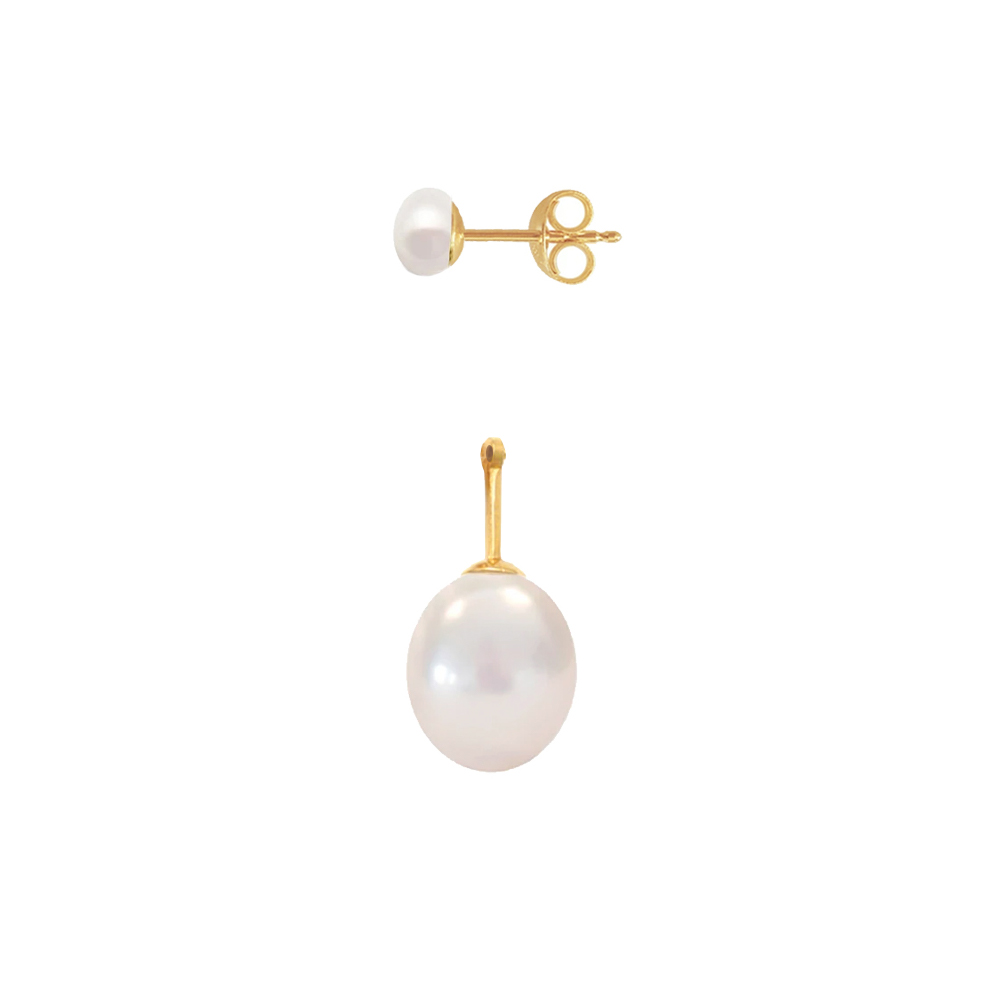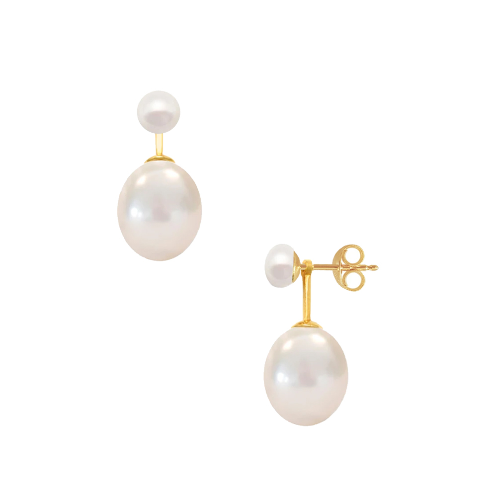 Τα σκουλαρίκια εντυπωσιάζουν με το σχέδιό τους καθώς αποτελούνται από 2 τμήματα. Το ένα τμήμα είναι καρφωτό σκουλαρίκι με λευκά μαργαριτάρια Fresh Water Pearl, άριστης ποιότητας σε σχήμα Button (κουμπί), διαμέτρου 4 - 4,5 χιλιοστών  και το άλλο μία χρυσή βάση 14 καρατίων στην οποία υπάρχει το μαργαριτάρι Fresh Water Pearl διαμέτρου 8,5x11 χιλιοστών σε σχήμα Long, με συνολικό μήκος περίπου 2 εκατοστά.