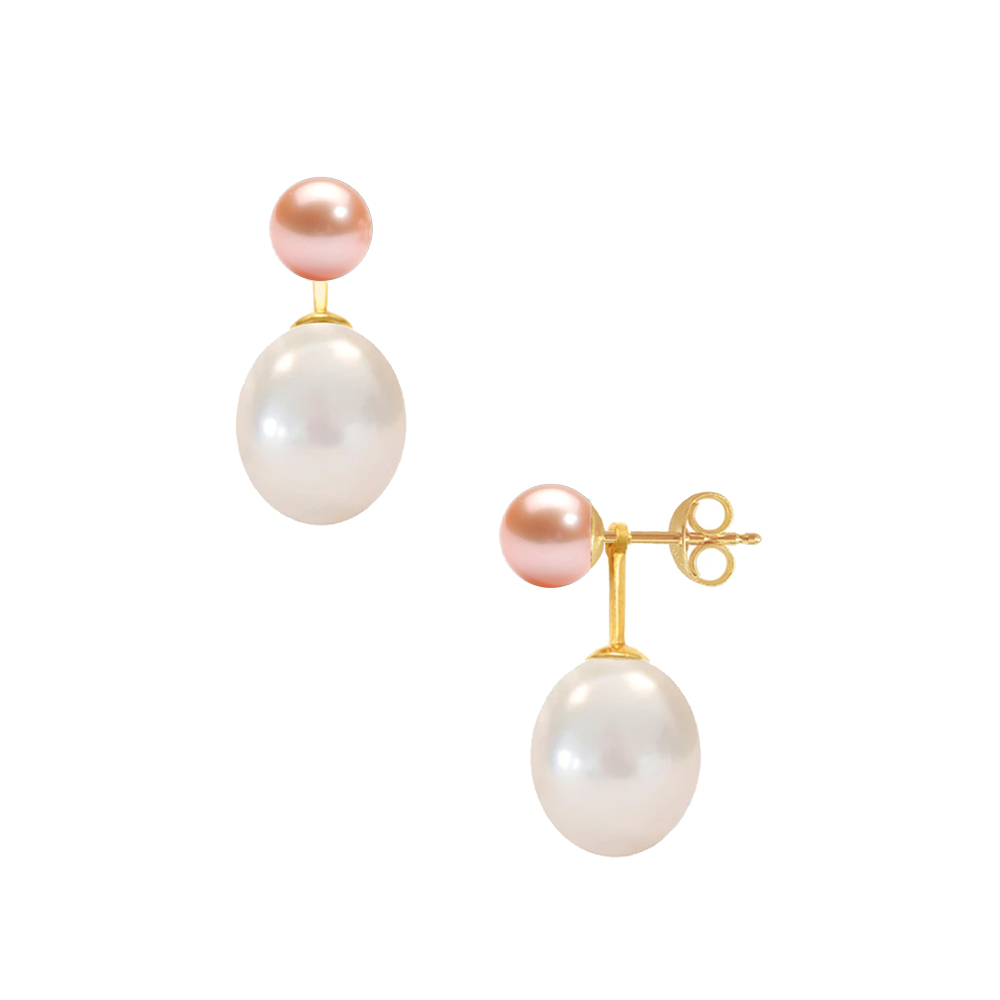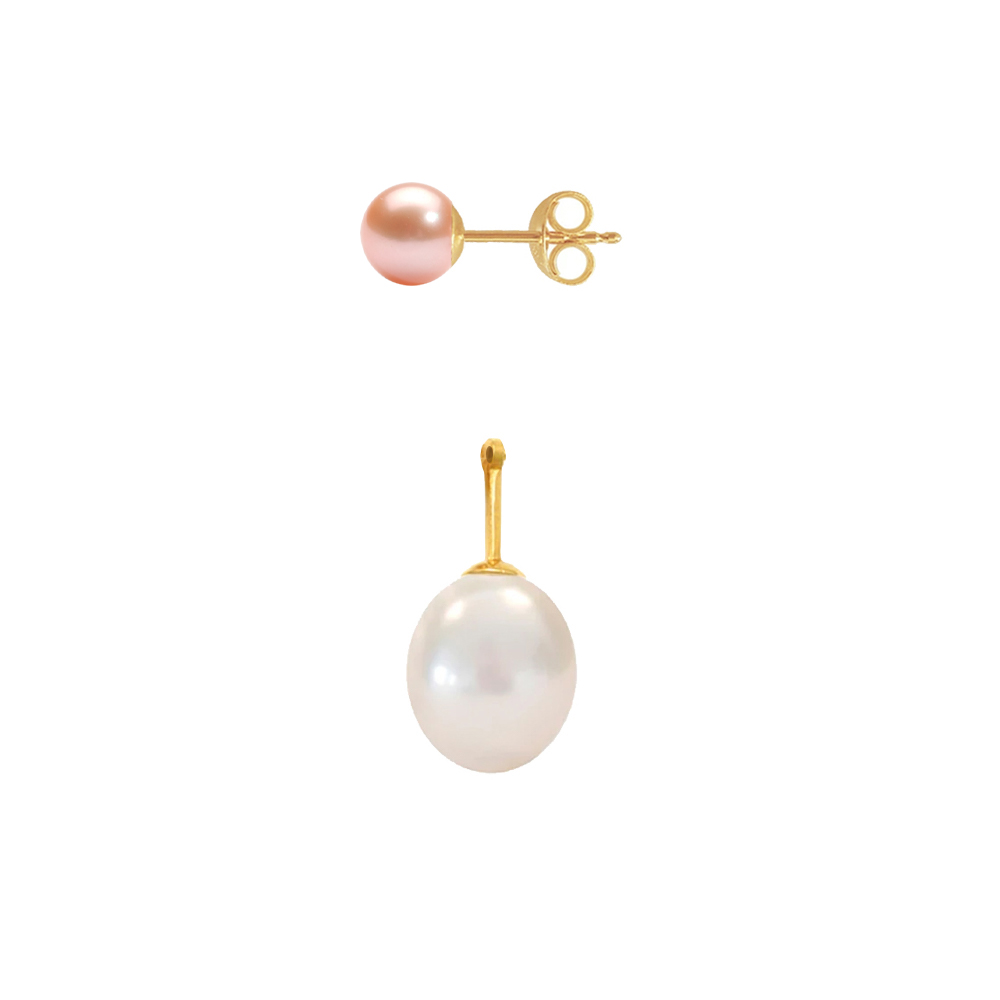 Τα σκουλαρίκια εντυπωσιάζουν με το σχέδιό τους καθώς αποτελούνται από 2 τμήματα. Το ένα τμήμα είναι καρφωτό σκουλαρίκι με 2 σομόν μαργαριτάρια QTV Akoya Japan 5-5.5χιλιοστών  και το άλλο μία χρυσή βάση 14 καρατίων στην οποία υπάρχουν 2 λευκά μαργαριτάρια Fresh Water Pearl διαμέτρου 8,5x11 χιλιοστών σε σχήμα Long με συνολικό μήκος περίπου 2 εκατοστά.