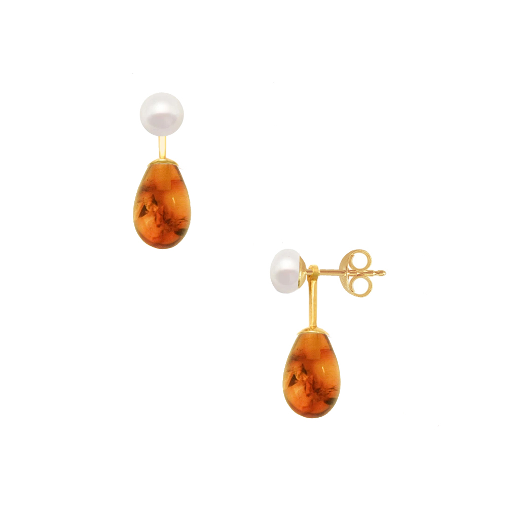 Τα σκουλαρίκια εντυπωσιάζουν με το σχέδιό τους καθώς αποτελούνται από 2 τμήματα. Το ένα τμήμα είναι καρφωτό σκουλαρίκι με λευκά μαργαριτάρια Fresh Water Pearl, άριστης ποιότητας σε σχήμα Button (κουμπί), διαμέτρου 4 - 4.5 χιλιοστών  και το άλλο μία χρυσή βάση 14 καρατίων με 2 ημιπολύτιμους λίθους Κεχριμπάρι σε σχήμα Drop (σταγόνα), διαμέτρου 9x12,5 χιλιοστών με συνολικό μήκος περίπου 2 εκατοστά.