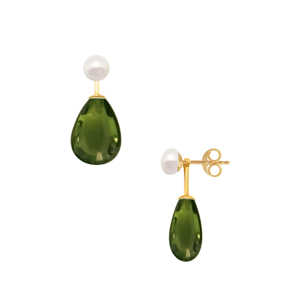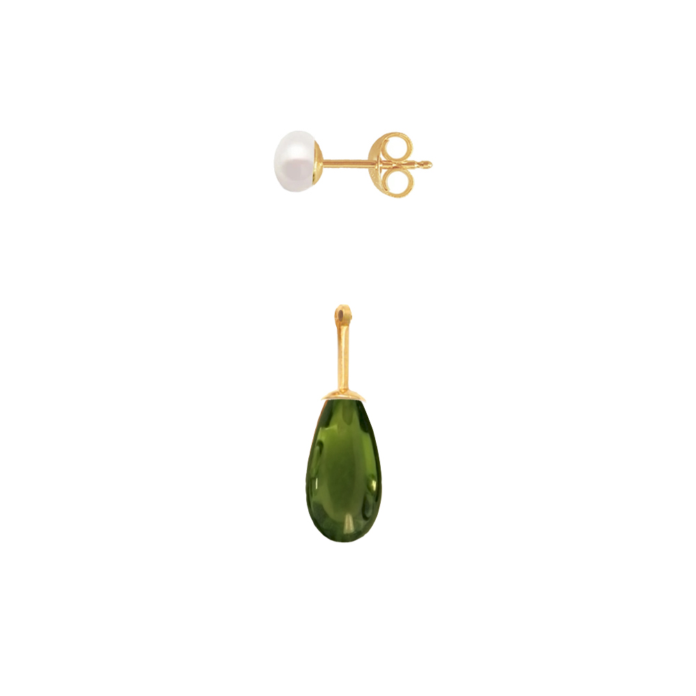 Τα σκουλαρίκια εντυπωσιάζουν με το σχέδιό τους καθώς αποτελούνται από 2 τμήματα. Το ένα τμήμα είναι καρφωτό σκουλαρίκι με λευκά μαργαριτάρια Fresh Water Pearl, άριστης ποιότητας σε σχήμα Button (κουμπί), διαμέτρου 4 - 4.5 χιλιοστών  και το άλλο μία χρυσή βάση 14 καρατίων με 2 ημιπολύτιμους λίθους Peridot Cubic Zircon σε σχήμα Drop (σταγόνα), διαμέτρου 9x12,5 χιλιοστών με συνολικό μήκος περίπου 2 εκατοστά.