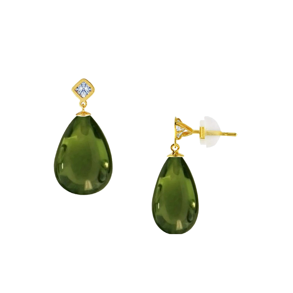 • Ένα φανταστικό ζευγάρι σκουλαρίκια με ημιπολύτιμους λίθους Peridot Cubic Zircon σε σχήμα Drop (σταγόνα), διαμέτρου 9 x 12,5 χιλιοστών.