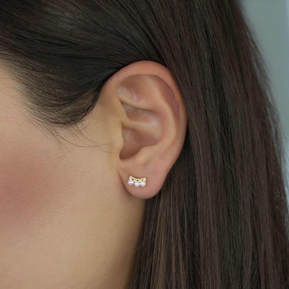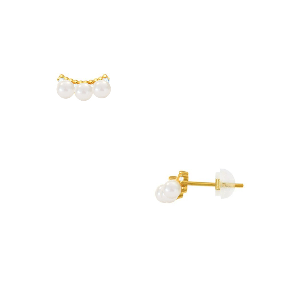 • Ένα υπέροχο ζευγάρι καρφωτά σκουλαρίκια με 3 λευκά μαργαριτάρια Q.T.V. Akoya διαμέτρου 3 χιλιοστών, άριστης ποιότητας.