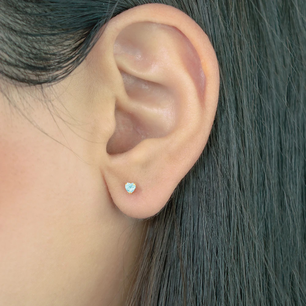 • Ένα εντυπωσιακό μονόπετρο ζευγάρι σκουλαρίκια με ημιπολύτιμο λίθο aqua διαμέτρου περίπου 3,5 χιλιοστών, σε σχήμα καρδιά.