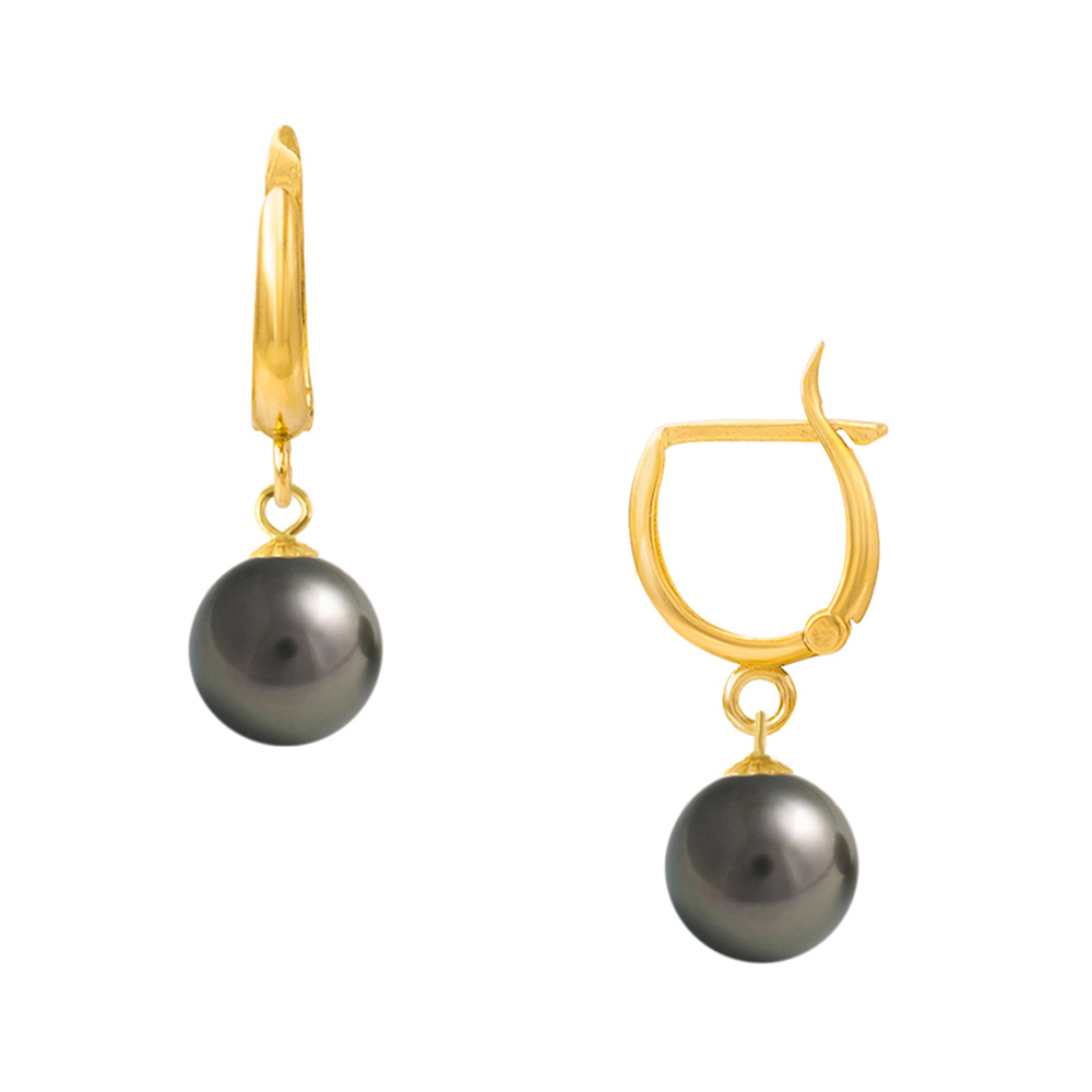 • Ένα υπέροχο ζευγάρι κρεμαστά σκουλαρίκια με μαύρα μαργαριτάρια QTV Akoya διαμέτρου 7,5-8 χιλιοστών, σε σχήμα Round