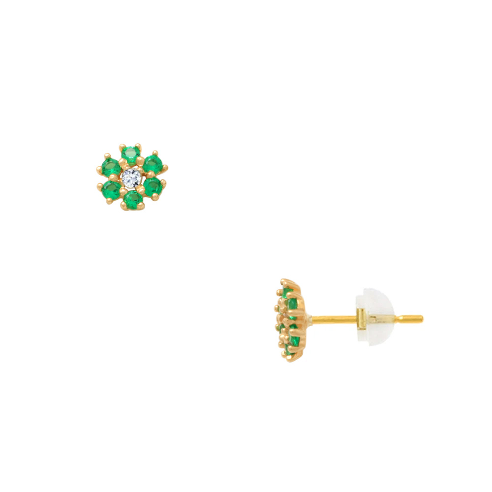 • Ένα υπέροχο ζευγάρι καρφωτά σκουλαρίκια διαμέτρου 5 χιλιοστών σε σχήμα λουλούδι με φασεταρισμένα σμαράγδια.