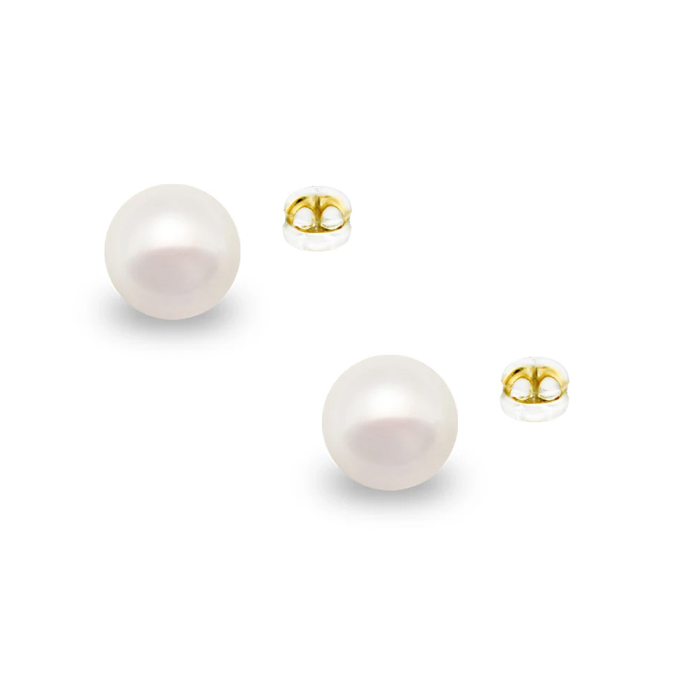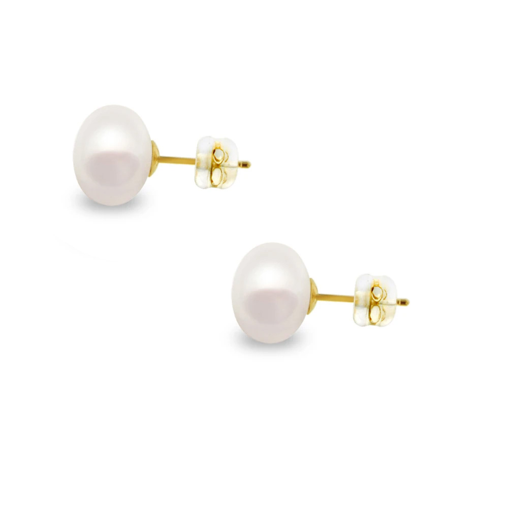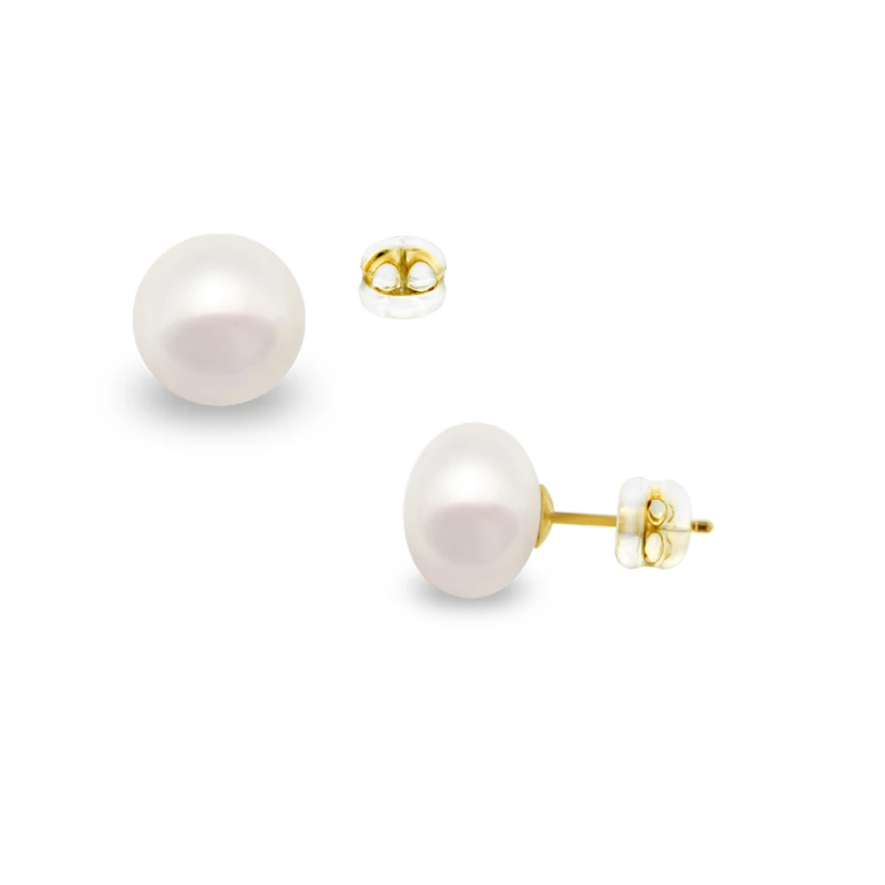 Σκουλαρίκια Κ14 χρυσά με κούμπωμα σιλικόνη και λευκά μαργαριτάρια 8 χιλιοστών - F126730