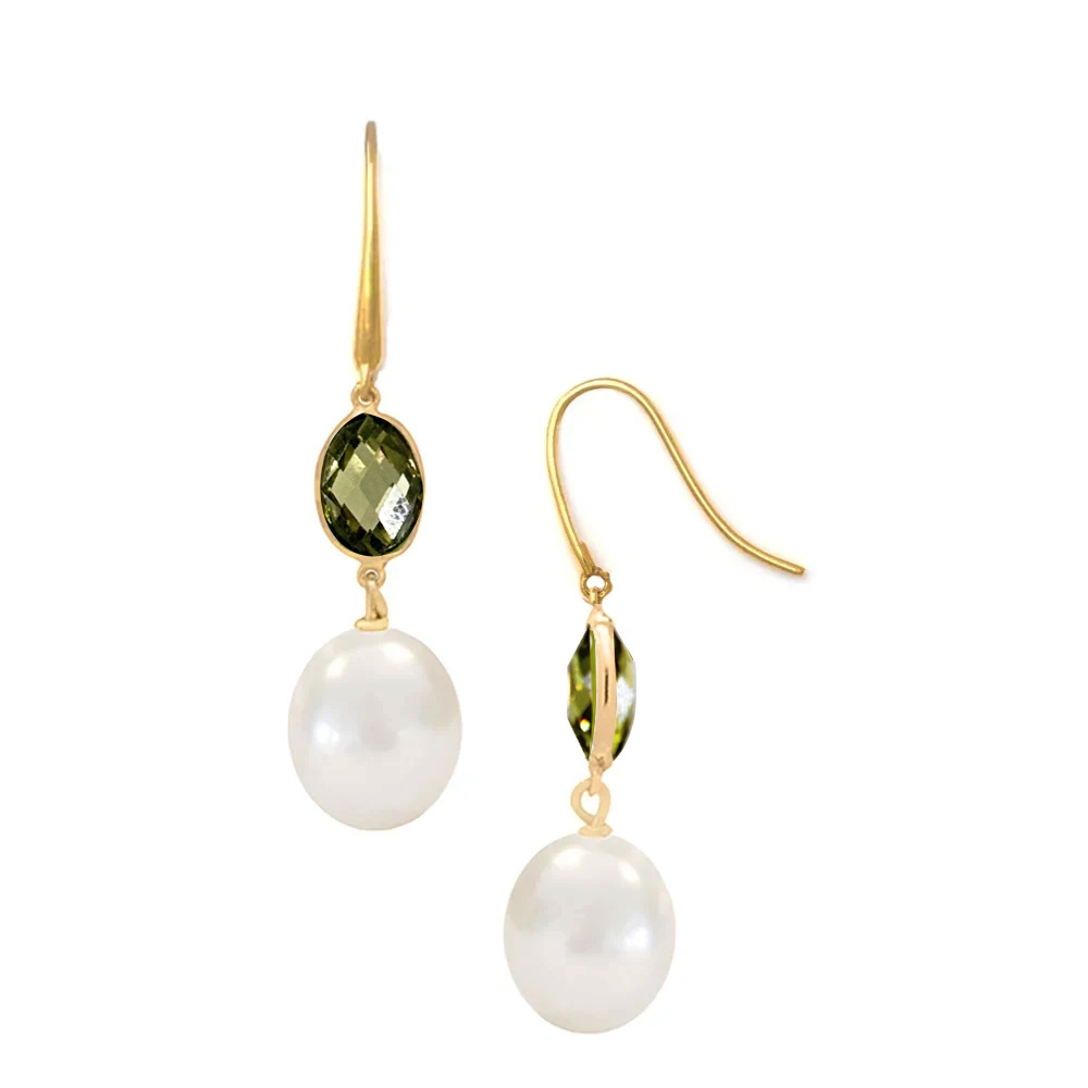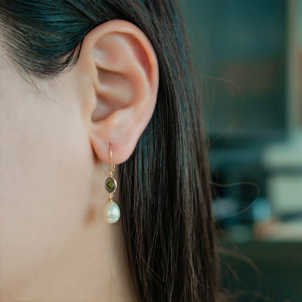 Η κρεμαστή χρυσή βάση 14 καρατιών και το μαργαριτάρι ενώνονται με έναν λαμπερό ημιπολύτιμο λίθο Peridot CZ, ο οποίος είναι σε χρυσό καστόνι 14 καρατιών διαμέτρου 5x7 χιλιοστών, προσφέροντας κίνηση στο σκουλαρίκι.