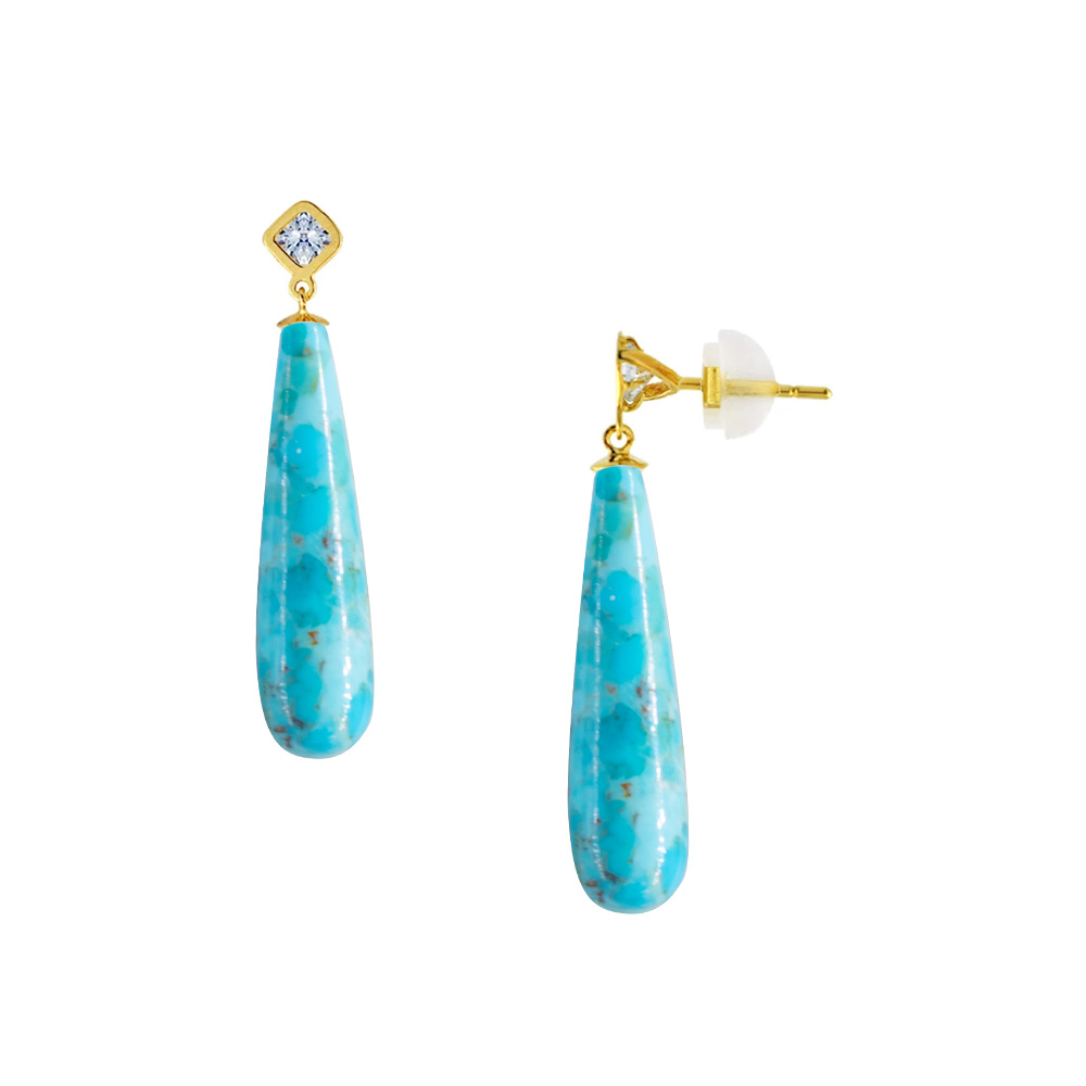 • Ένα υπέροχο ζευγάρι κρεμαστά σκουλαρίκια με ημιπολύτιμο λίθο Spiny Oyster σε σχήμα σταγόνας με διάσταση 8x30 χιλιοστών και αποχρώσεις του γαλάζιου.