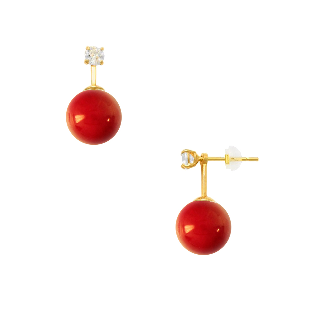 Το ένα τμήμα είναι καρφωτό σκουλαρίκι με ένα λαμπερό ζιργκόν διαμέτρου 3 χιλιοστών, και το άλλο μία χρυσή βάση 14 καρατίων με ημιπολύτιμους λίθους Coral σε σχήμα Round (σταγόνα), διαμέτρου 8 χιλιοστών με συνολικό μήκος περίπου 1 εκατοστό.