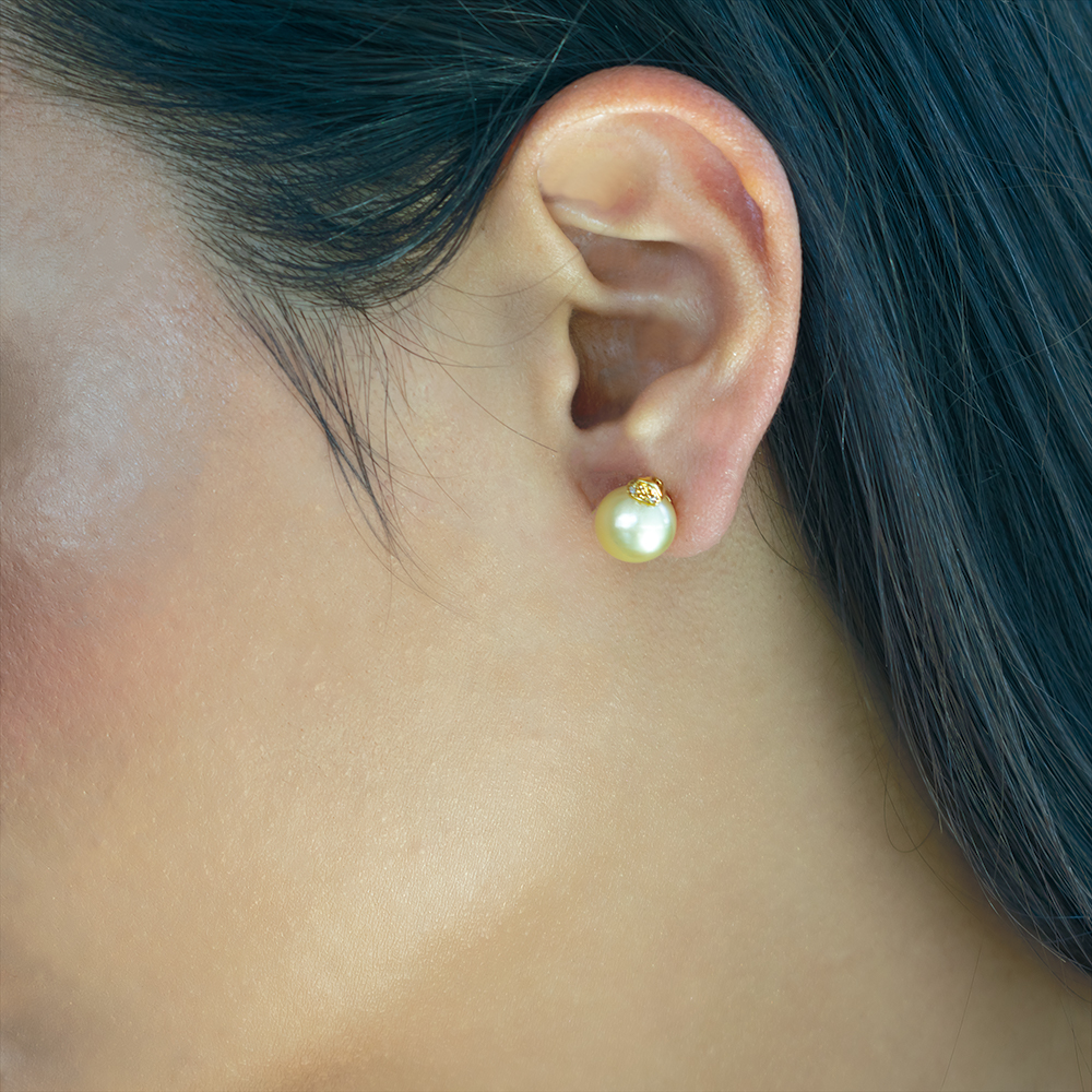 • Ένα φανταστικό ζευγάρι σκουλαρίκια με 2 σπάνια και εντυπωσιακά φυσικά GOLD South Sea Indonesia μαργαριτάρια διαμέτρου 10,1 χιλιοστών σε σχήμα Round (στρογγυλά) άριστης ποιότητας και βάρους 0,72 MOMME.