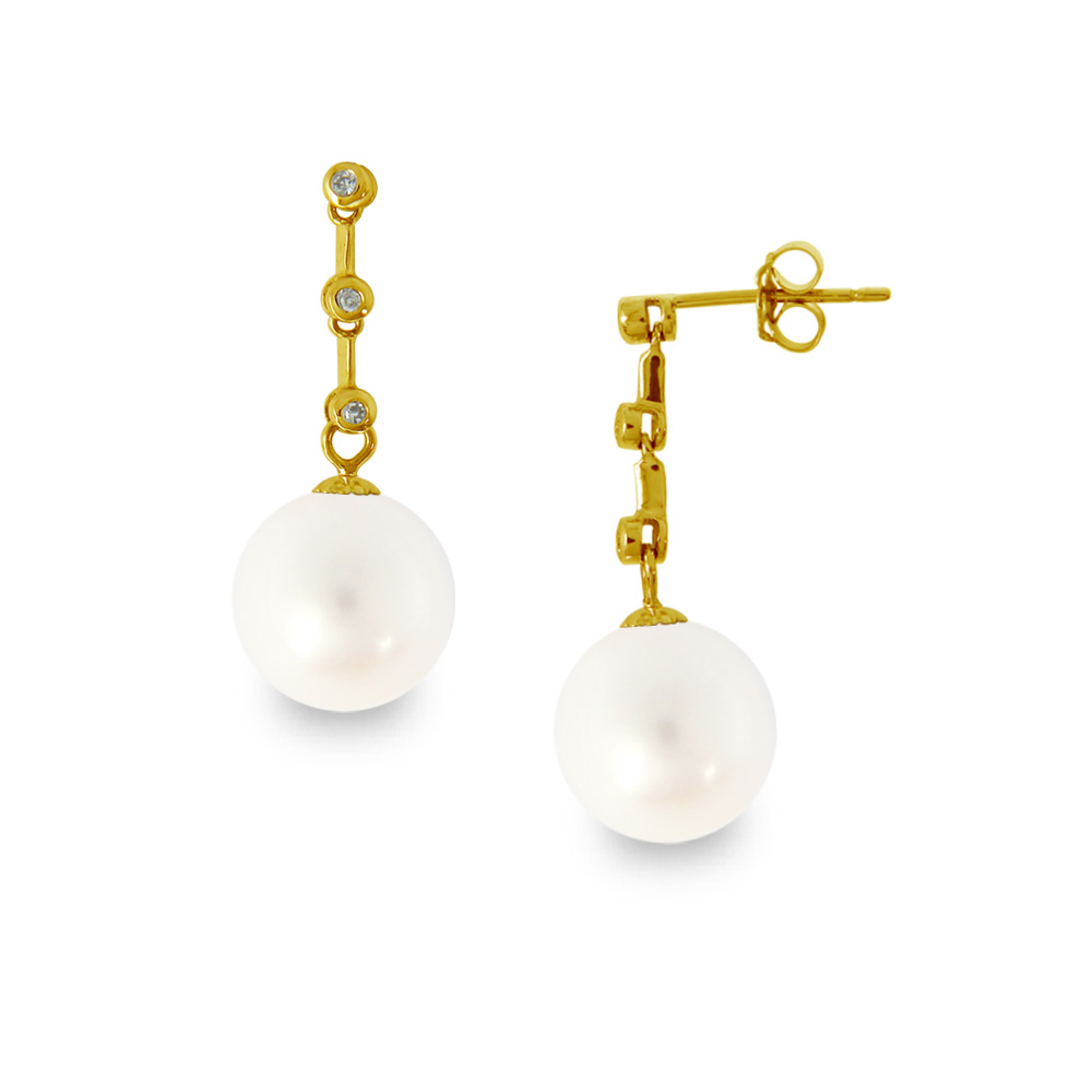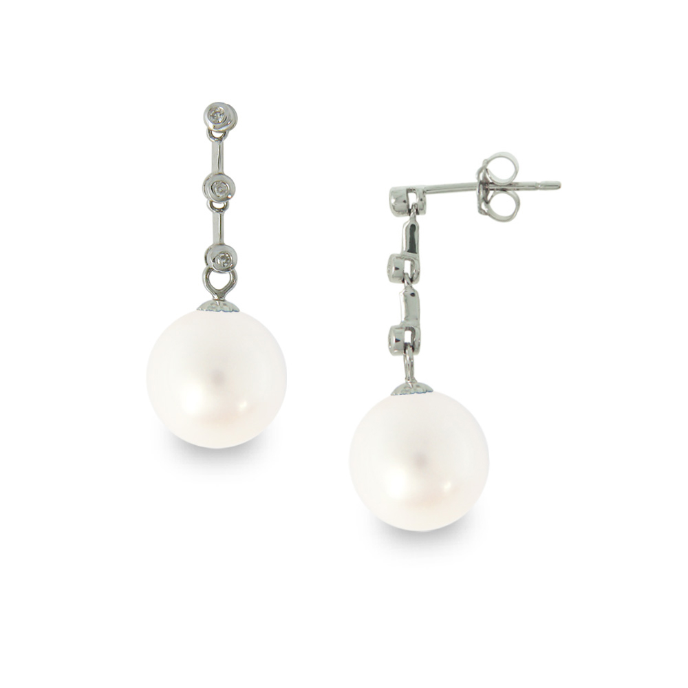 • Ένα φανταστικό ζευγάρι κρεμαστά σκουλαρίκια με 2 εντυπωσιακά και ολοστρόγγυλα λευκά μαργαριτάρια QTV Akoya Pearl, άριστης ποιότητας διαμέτρου 9 χιλιοστών σε χρυσή βάση 18 καρατίων με 6 διαμάντια 0,03 καρατίων.