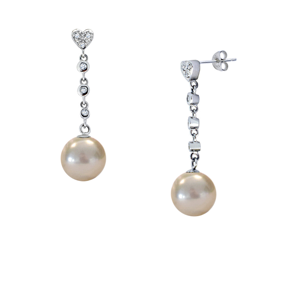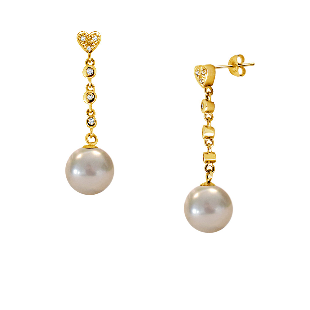 • Ένα φανταστικό ζευγάρι κρεμαστά σκουλαρίκια με 2 εντυπωσιακά και ολοστρόγγυλα γκρι μαργαριτάρια QTV Akoya Pearl, άριστης ποιότητας διαμέτρου 7,5 - 8 χιλιοστών σε χρυσές βάσεις 18 καρατίων με 12 διαμάντια 0,11 καρατίων.