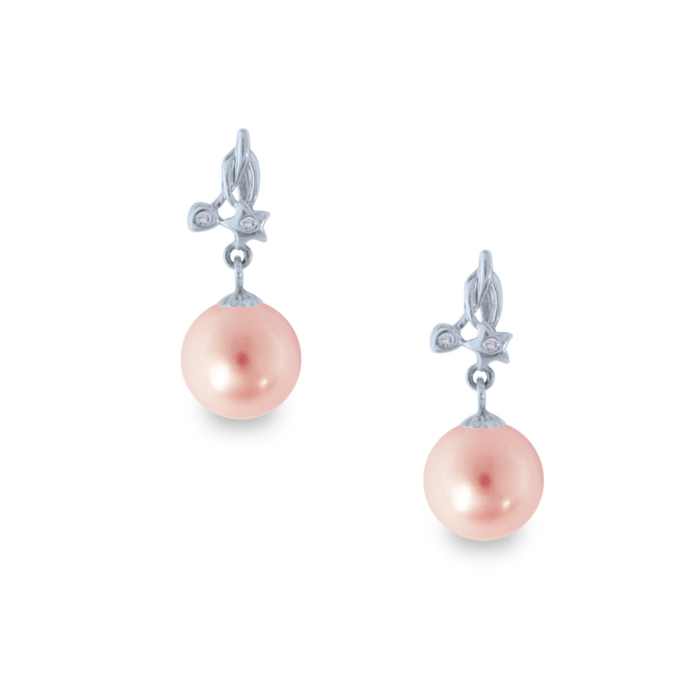 • Ένα φανταστικό ζευγάρι κρεμαστά σκουλαρίκια με 2 εντυπωσιακά σομόν μαργαριτάρια QTV Akoya Pearl, άριστης ποιότητας σε σχήμα Round (στρογγυλά), διαμέτρου 7,5 - 8 χιλιοστών.