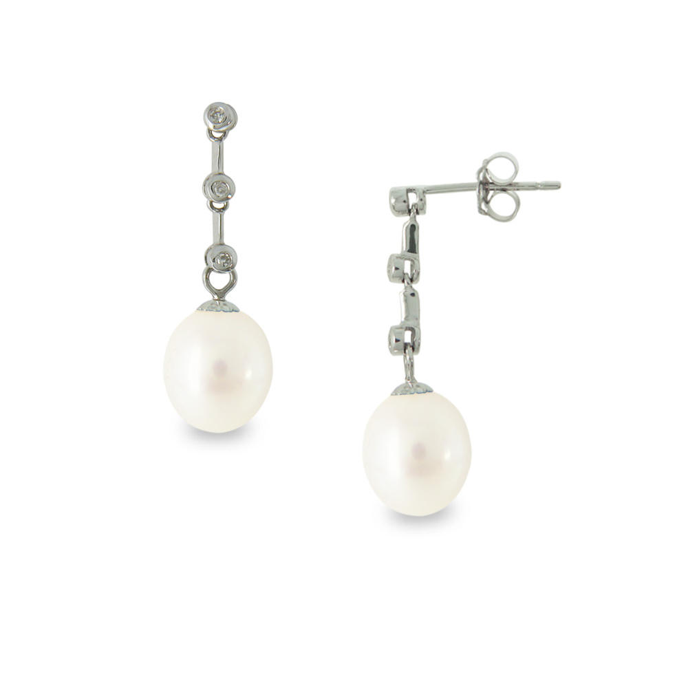 • Ένα φανταστικό ζευγάρι κρεμαστά σκουλαρίκια με 2 εντυπωσιακά λευκά μαργαριτάρια Fresh Water Pearl, άριστης ποιότητας σε σχήμα Drop (σταγόνα), διαμέτρου 8,5 x 11 χιλιοστών.
