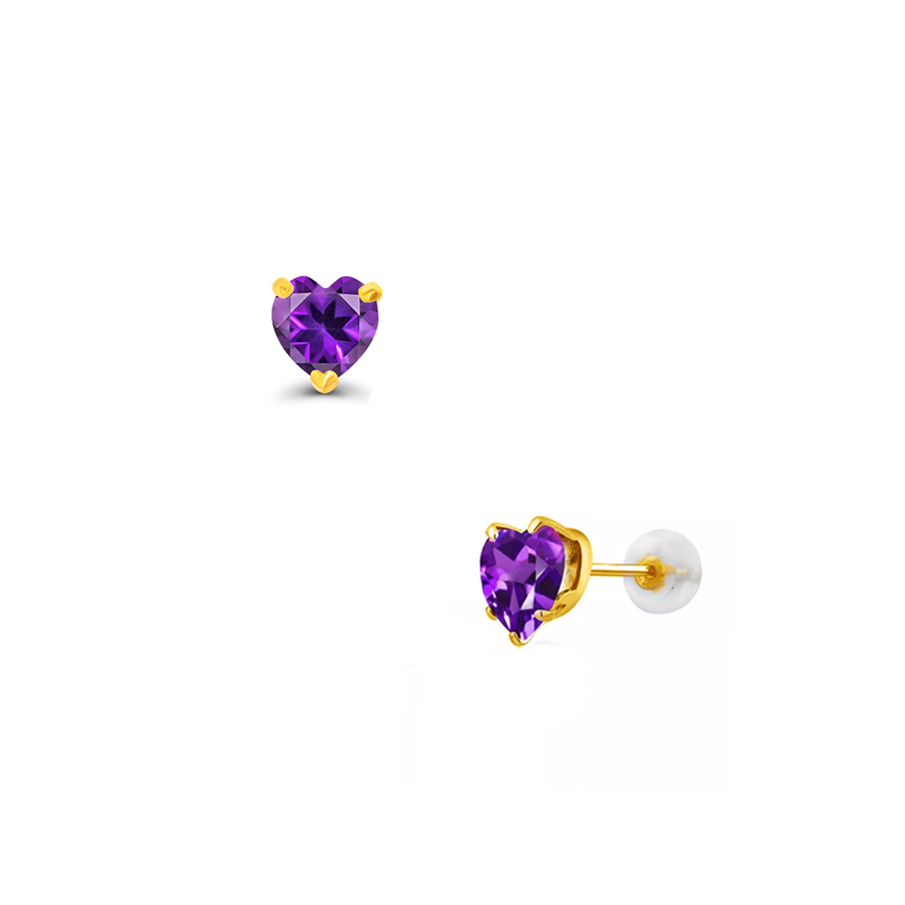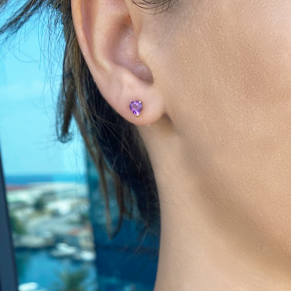 • Ένα εντυπωσιακό μονόπετρο ζευγάρι καρφωτά σκουλαρίκια με ημιπολύτιμο λίθο αμέθυστο διαμέτρου 5x6 χιλιοστών με ιδιαίτερη κοπή σχήμα καρδιάς (heart cut).