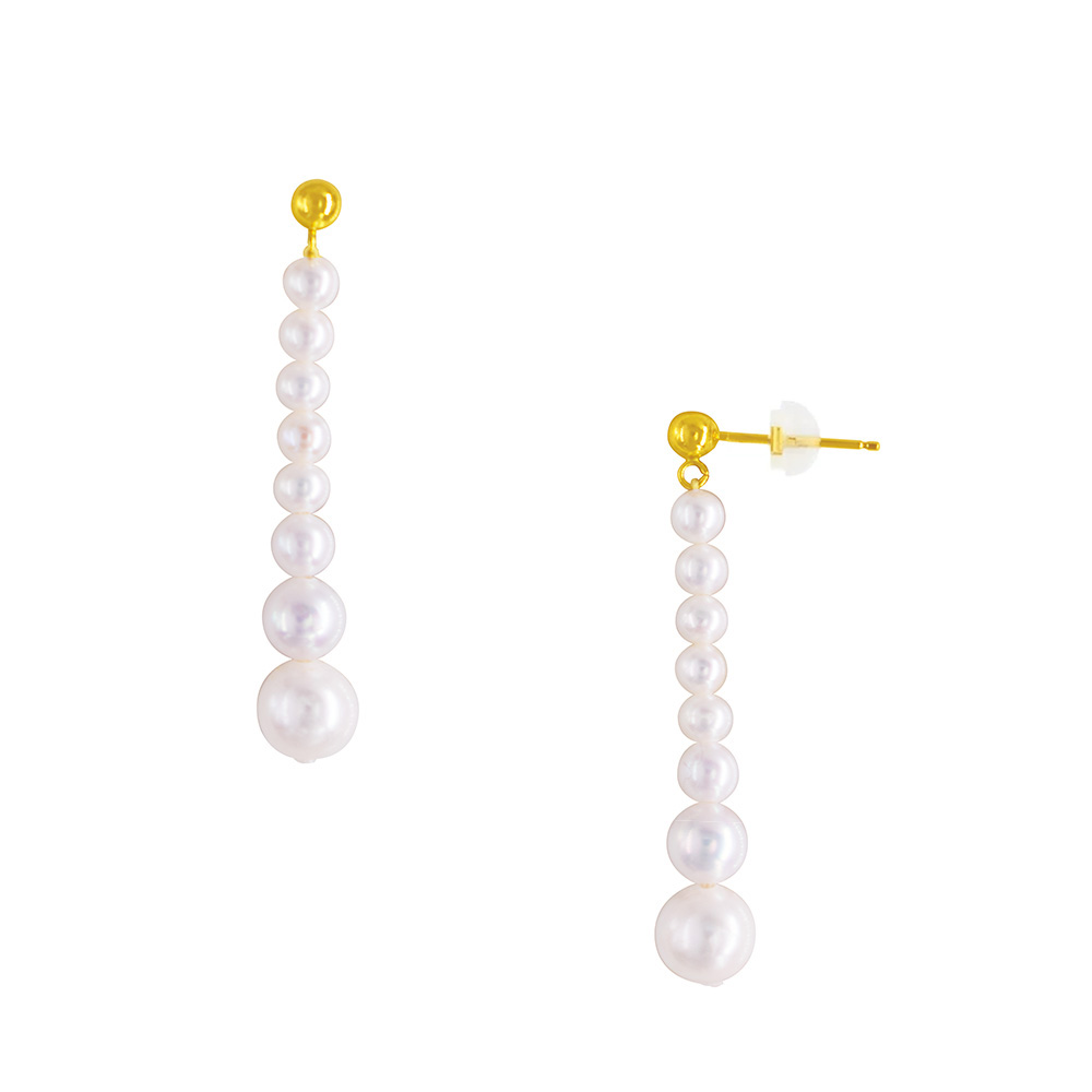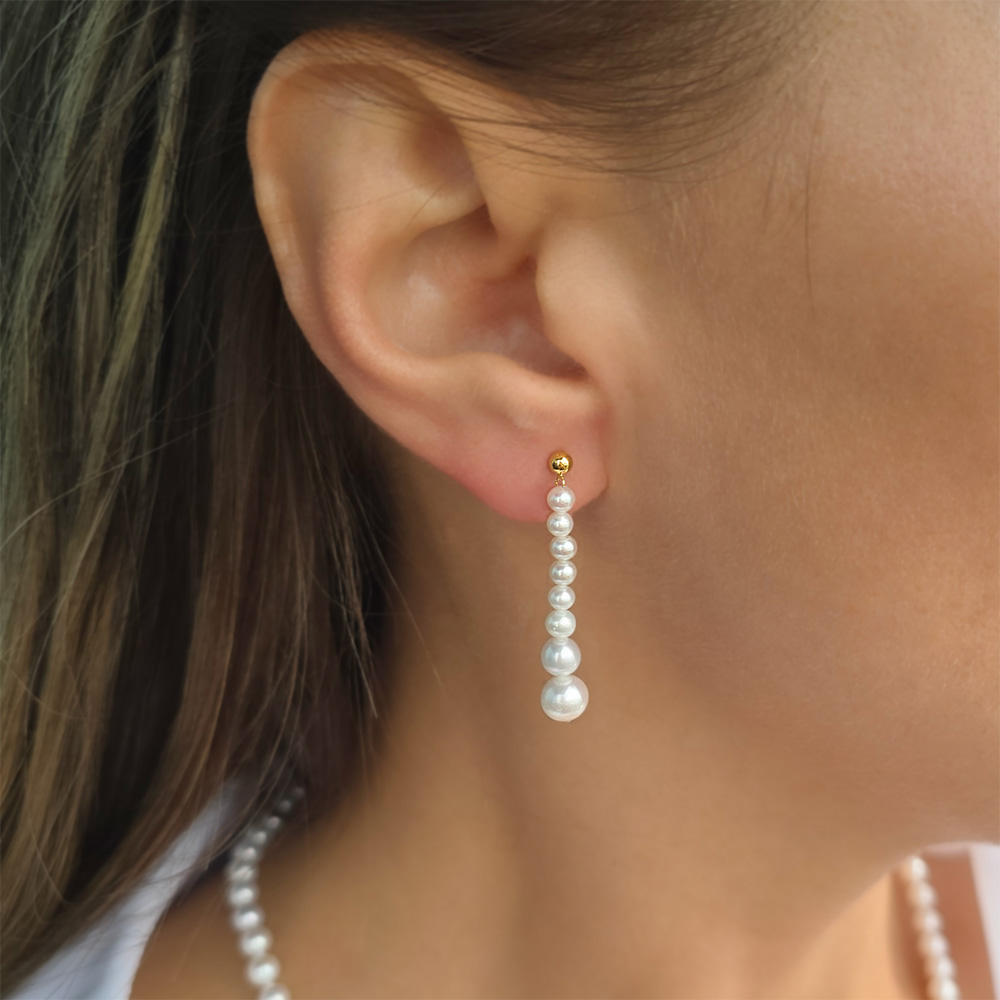 Η βάση των σκουλαρικιών έχει 2 χρυσές σφαίρες 18 καρατίων διαμέτρου 3 χιλιοστών και αποτελείται από 16 λευκά μαργαριτάρια σε style Degrade δηλαδή ξεκινούν από μαργαριτάρια των 3 χιλιοστών και καταλήγουν σε μαργαριτάρια των 6 χιλιοστών.