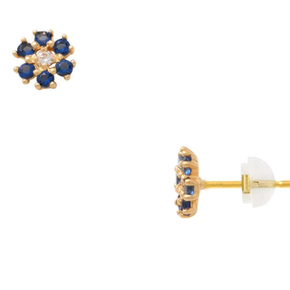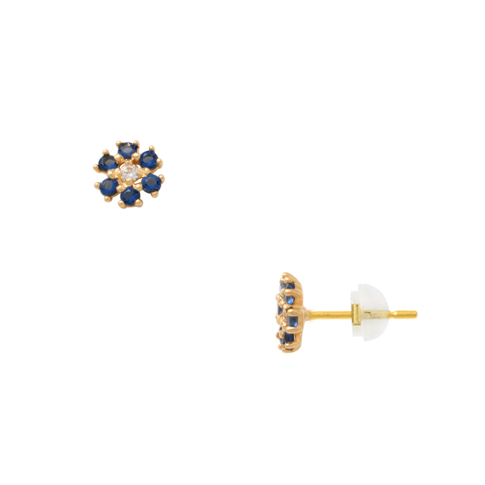 • Ένα υπέροχο ζευγάρι καρφωτά σκουλαρίκια διαμέτρου 5 χιλιοστών σε σχήμα λουλούδι με φασεταρισμένα ζαφείρια.