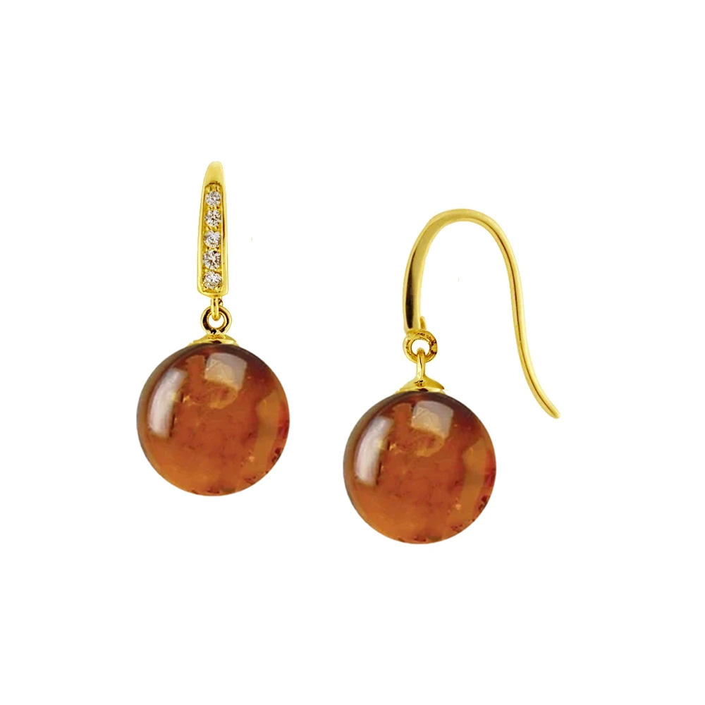 • Ένα υπέροχο ζευγάρι κρεμαστά σκουλαρίκια με στρόγγυλο ημιπολύτιμο λίθο amber διαμέτρου 12 χιλιοστών.