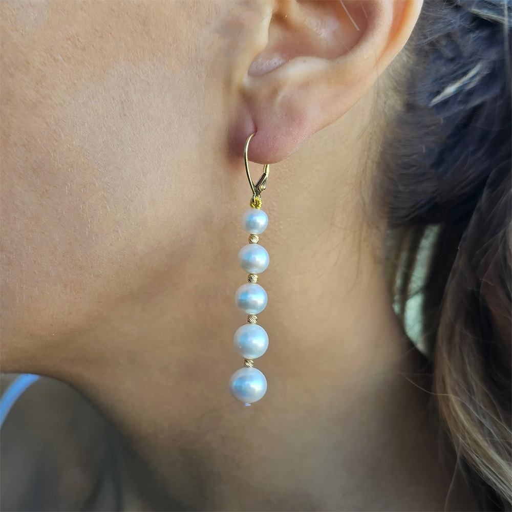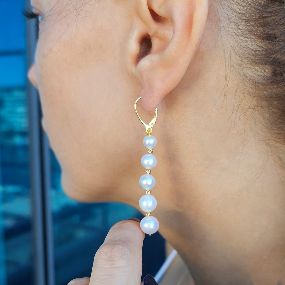 Το στυλ των σκουλαρικιών είναι Degrade που ξεκινάει από τα μαργαριτάρια των 6 χιλιοστών κοντά στο κούμπωμα και καταλήγει στα μεγαλύτερα μαργαριτάρια των 9 χιλιοστών όπου ανάμεσα τα χρυσά 14 καρατιών στοιχεία ξεκινούν 2,5 χιλιοστά καταλήγοντας στα 3 χιλιοστά.