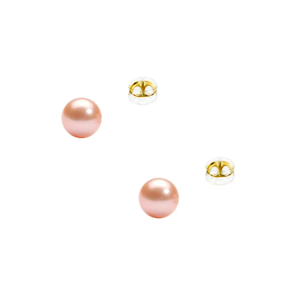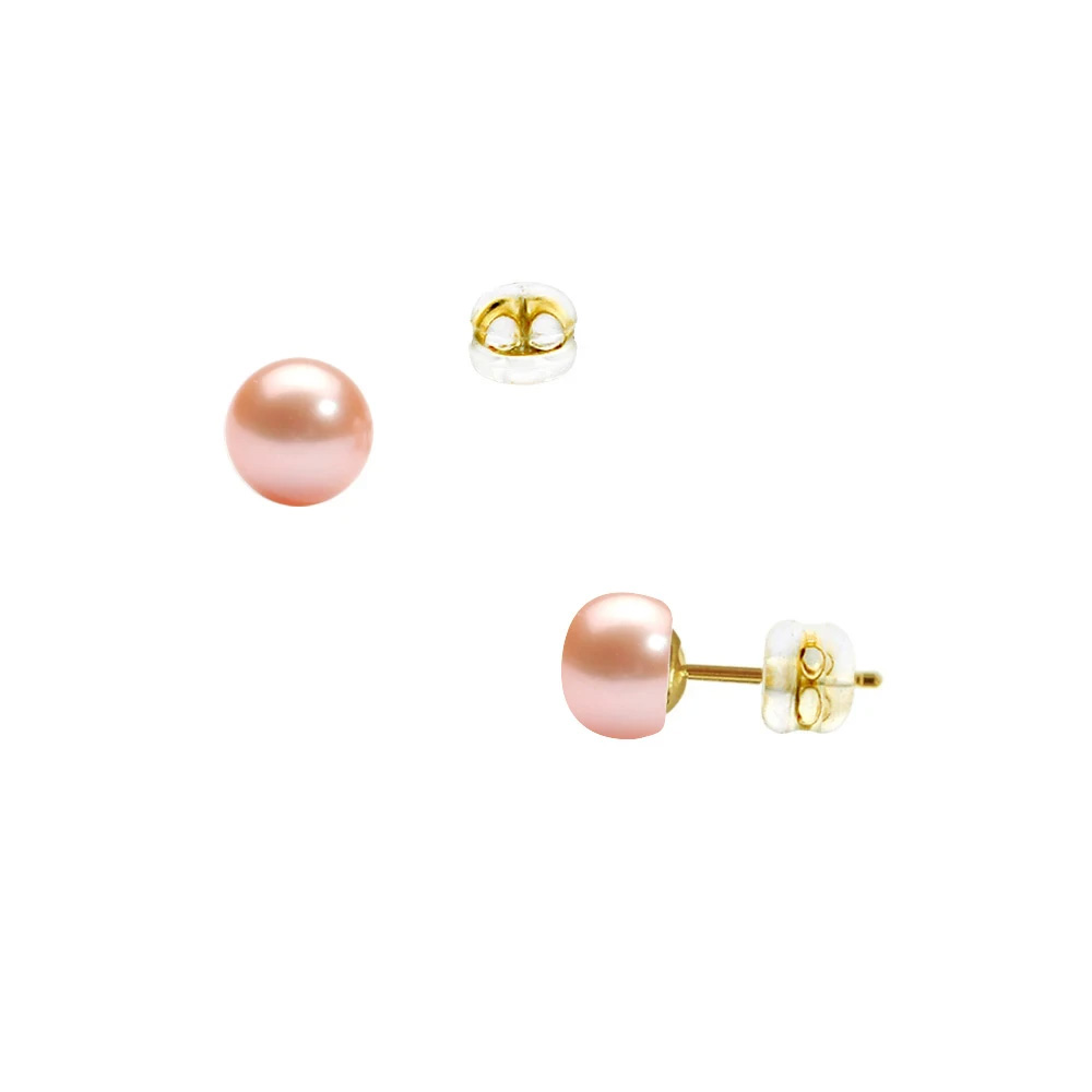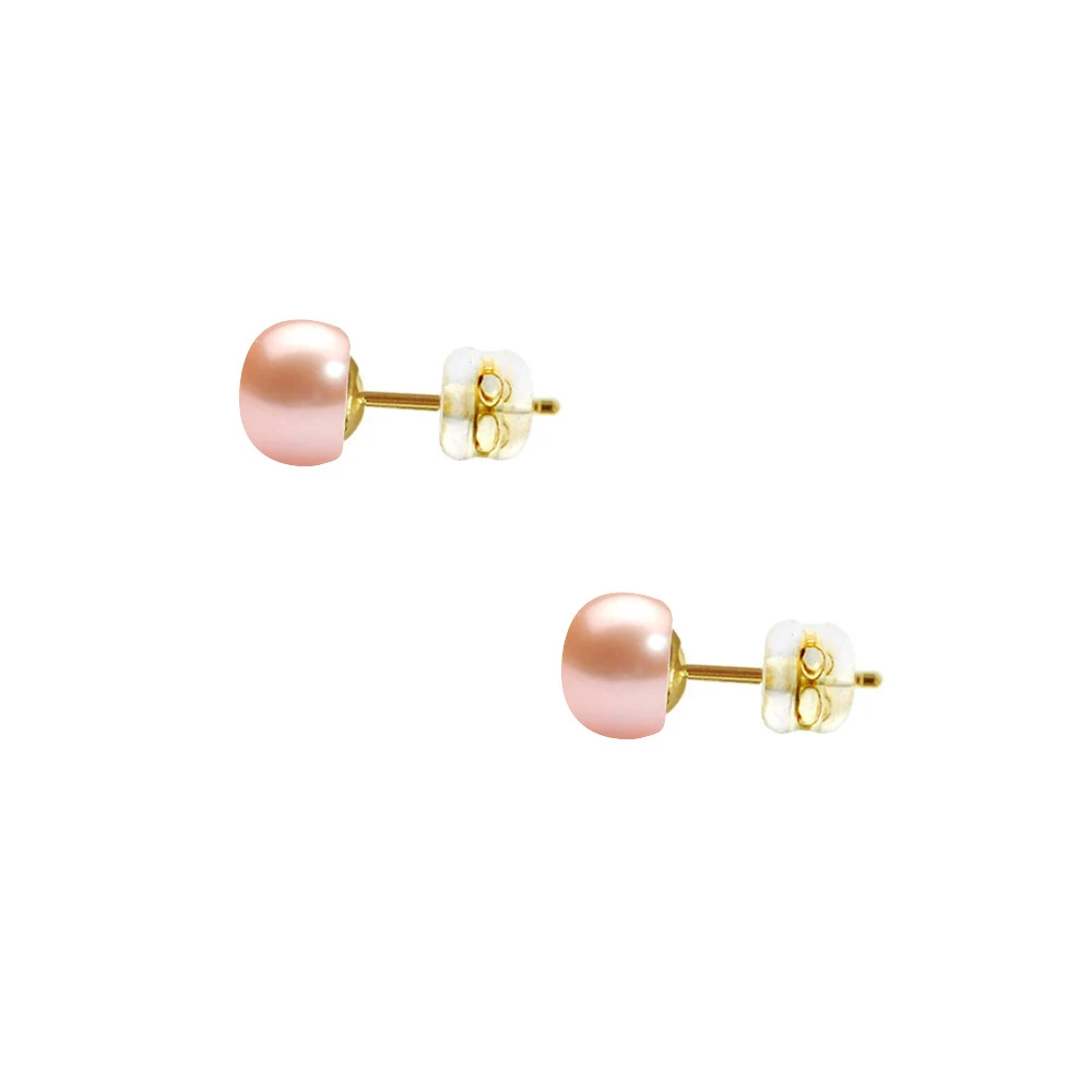 Σκουλαρίκια Κ14 χρυσά με κούμπωμα σιλικόνη και σομόν μαργαριτάρια 5,5-6 χιλιοστών - F126728S