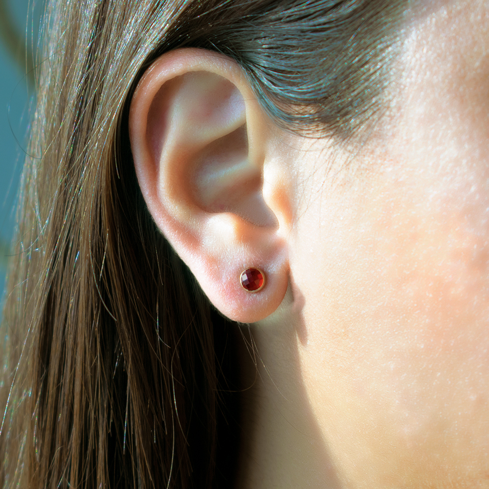 • Ένα φανταστικό ζευγάρι σκουλαρίκια με κόκκινο  ζιργκόν διαμέτρου 5,5 χιλιοστών.