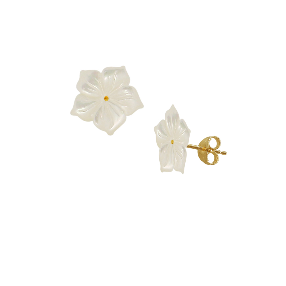• Ένα υπέροχο ζευγάρι σκουλαρίκια με λευκό λουλούδι, διαμέτρου 15,0 χιλιοστών και χρυσή βάση 14 καρατίων.