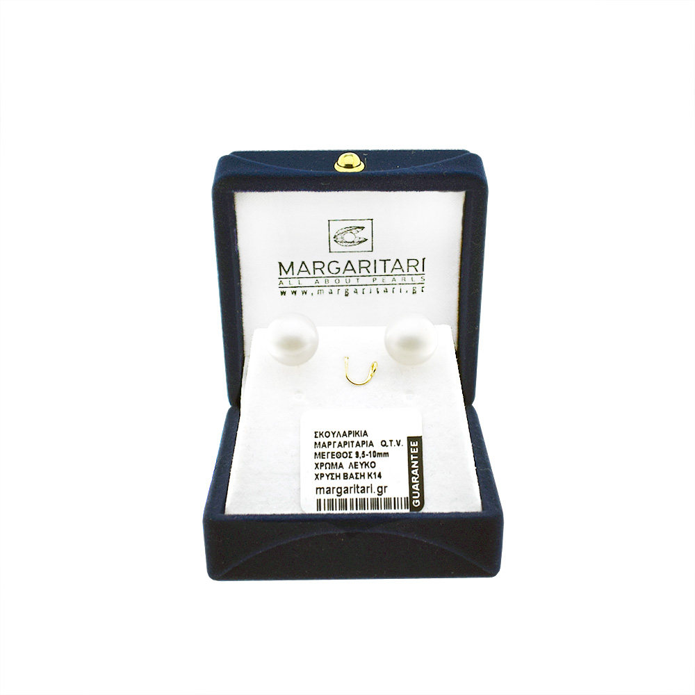 • Ένα υπέροχο ζευγάρι σκουλαρίκια με λευκά μαργαριτάρια QTV Akoya Pearl, άριστης ποιότητας σε σχήμα Round (στρογγυλά), διαμέτρου 9,5 - 10 χιλιοστών και χρυσή βάση 14 καρατίων.