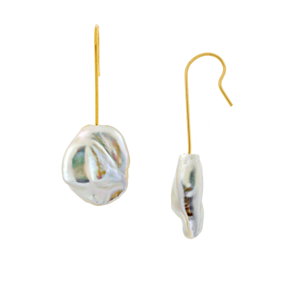 • Ένα υπέροχο ζευγάρι κρεμαστά σκουλαρίκια με λευκά μαργαριτάρια Biwa Fresh Water Pearl, άριστης ποιότητας σε σχήμα Baroque διαμέτρου 12,5 x 14  χιλιοστών.