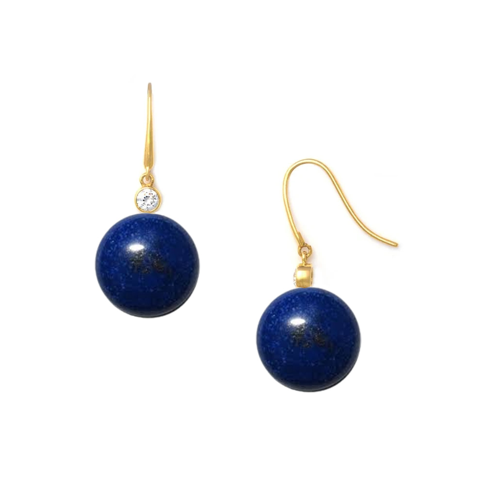 • Ένα υπέροχο ζευγάρι κρεμαστά σκουλαρίκια με στρόγγυλο ημιπολύτιμο λίθο lapis lazuli διαμέτρου 10 χιλιοστών.