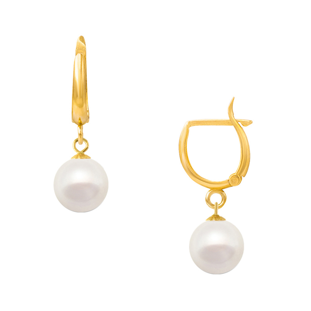 • Ένα υπέροχο ζευγάρι κρεμαστά σκουλαρίκια με λευκά μαργαριτάρια QTV Akoya διαμέτρου 7,5-8 χιλιοστών, σε σχήμα Round