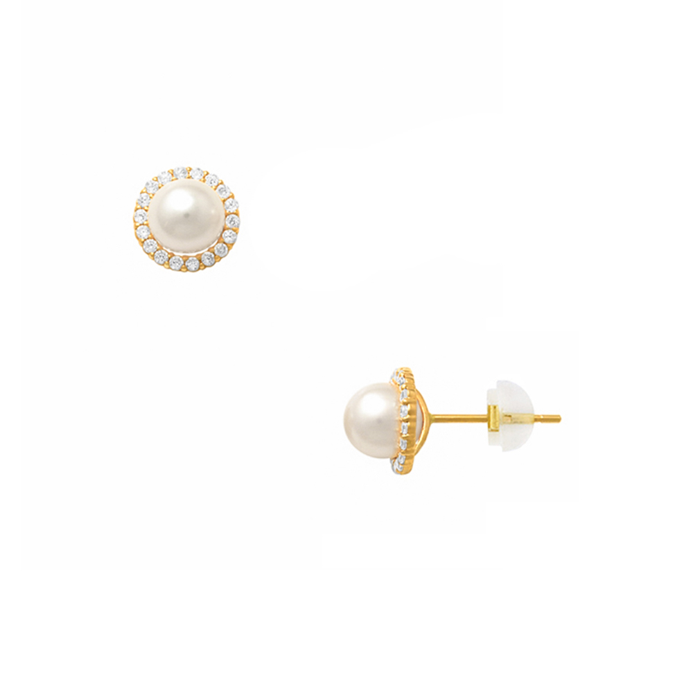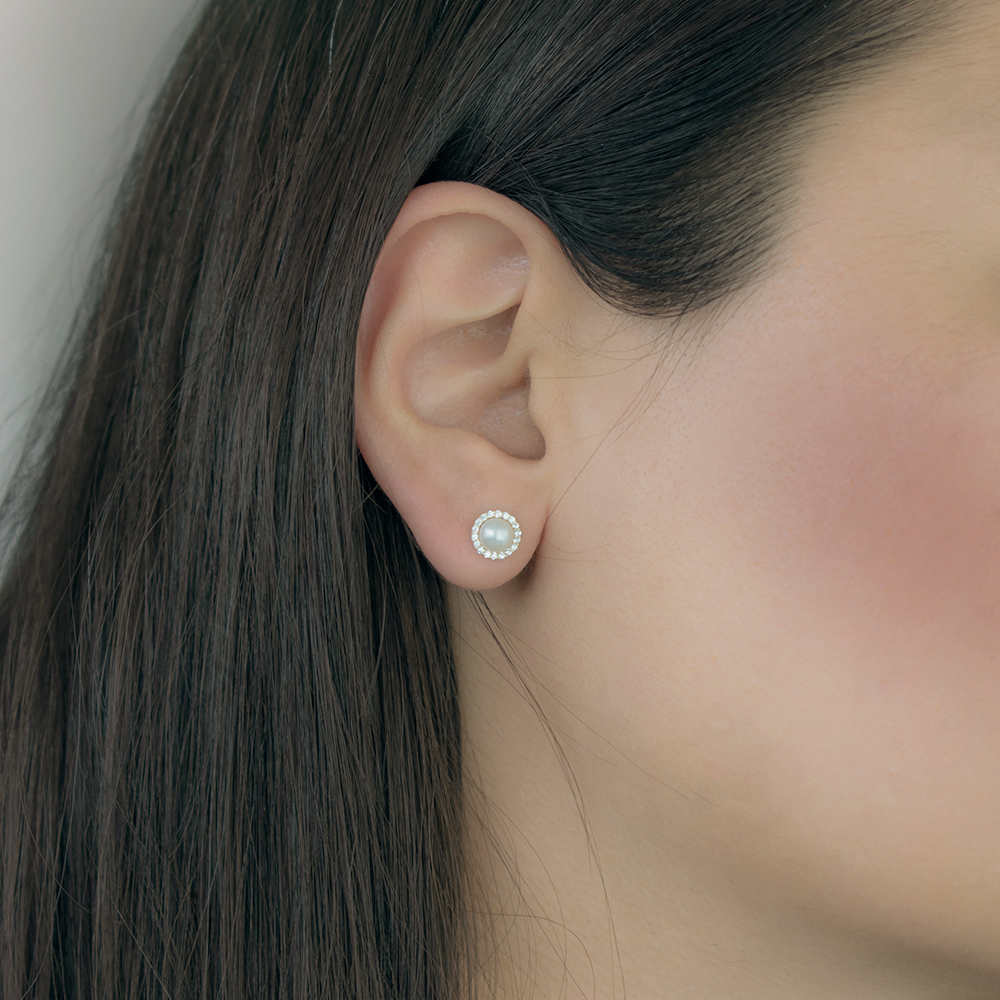 Το μαργαριτάρι αγκαλιάζουν περιμέτρικά 18 λαμπερά ζιργκόν.