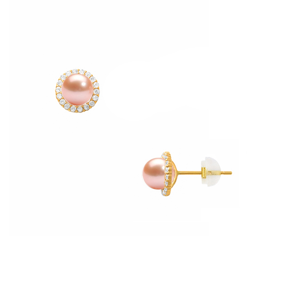 Σκουλαρίκια χρυσά Κ14 με σομόν μαργαριτάρια Q.T.V. Akoya και ζιργκόν - F124533S