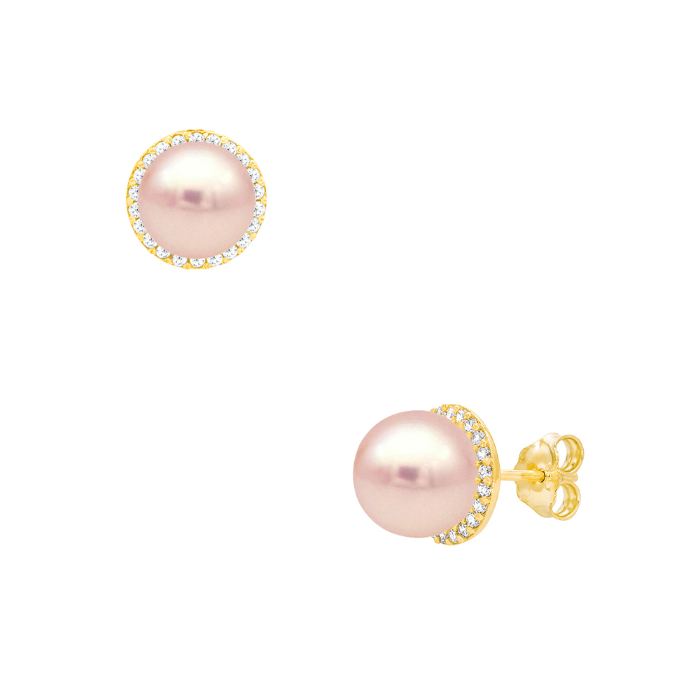 Σκουλαρίκια σε Κ14 χρυσή βάση με σομόν μαργαριτάρια Akoya και ζιργκόν - F124431S
