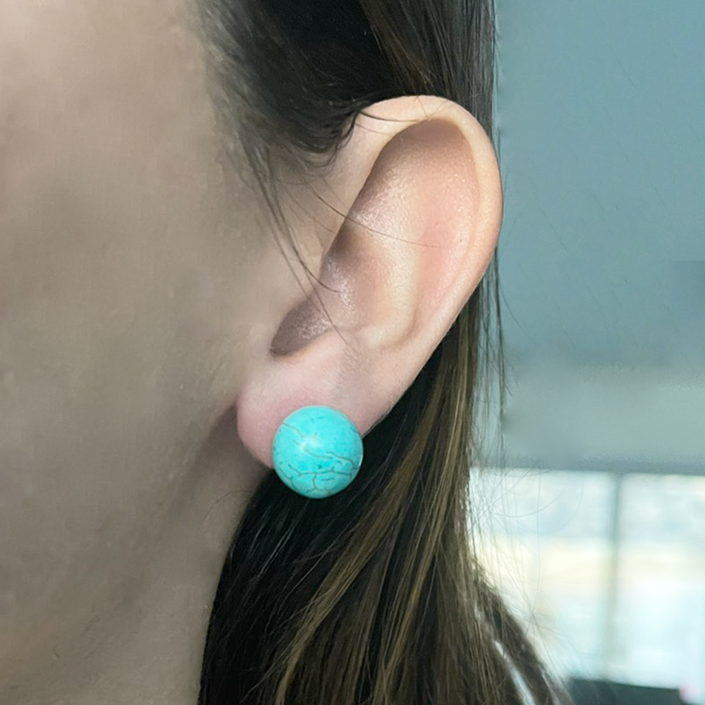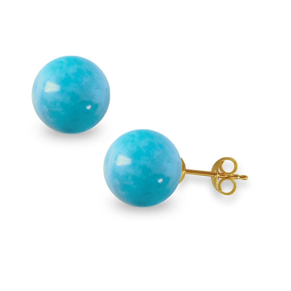 • Ένα υπέροχο ζευγάρι σκουλαρίκια με στρογγυλή ημιπολύτιμη πέτρα Τιρκουάζ διαμέτρου 12 χιλιοστών.