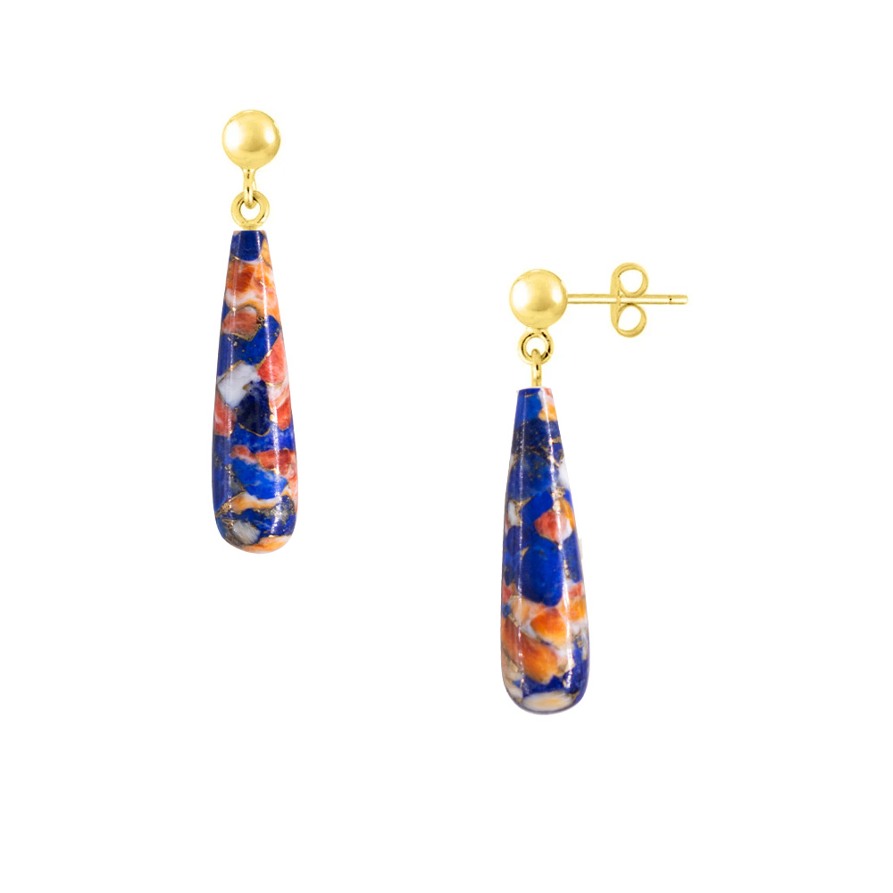 • Ένα υπέροχο ζευγάρι κρεμαστά σκουλαρίκια με ημιπολύτιμο λίθο Spiny Oyster σε σχήμα σταγόνας με διάσταση 8x30 χιλιοστών και εντυπωσιακές αποχρώσεις του μπλε και του πορτοκαλί.