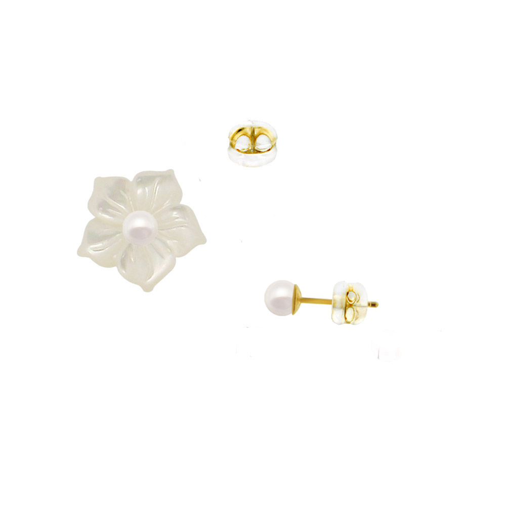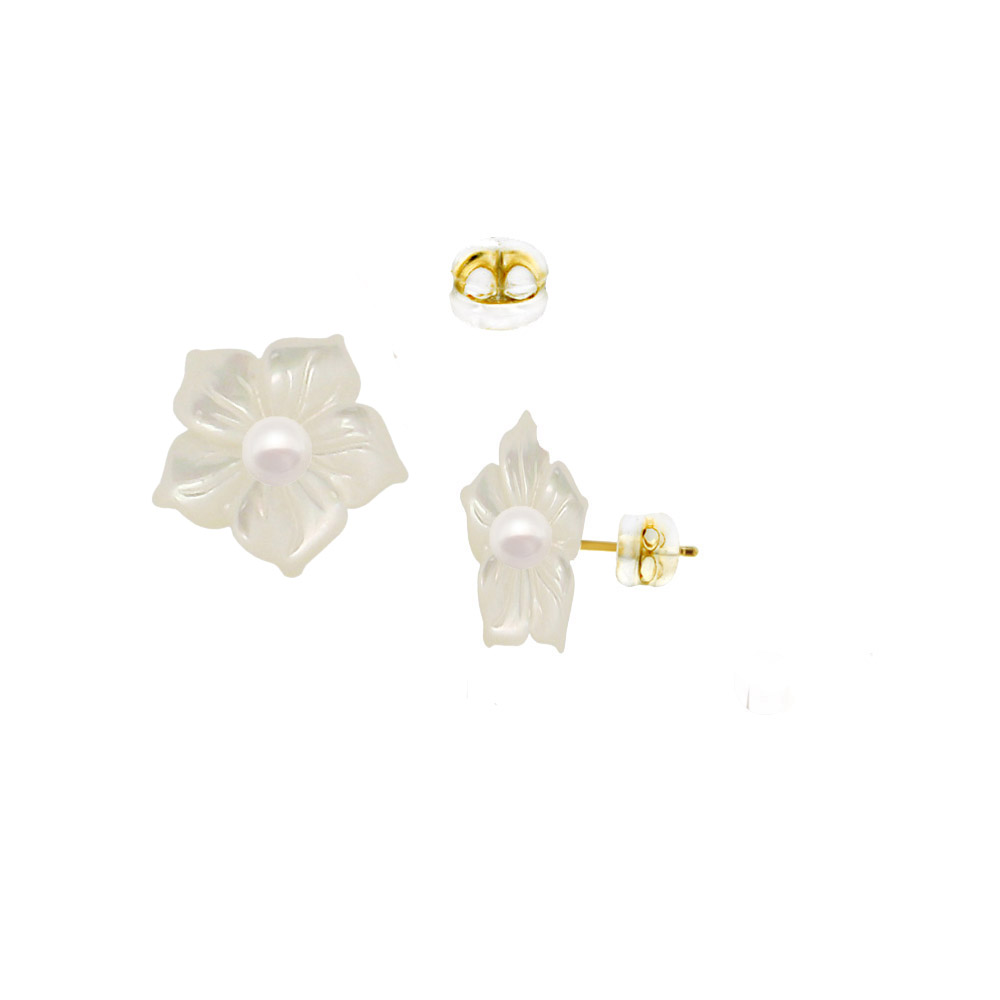 • Ένα υπέροχο ζευγάρι σκουλαρίκια με λευκό λουλούδι, διαμέτρου 15,0 χιλιοστών που στο κέντρο του υπάρχει ένα λευκό στρογγυλό μαργαριτάρι Q.T.V. AKOYA JAPAN διαμέτρου 4 χιλιοστών με χρυσή βάση 14 καρατίων και κούμπωμα σιλικόνης.