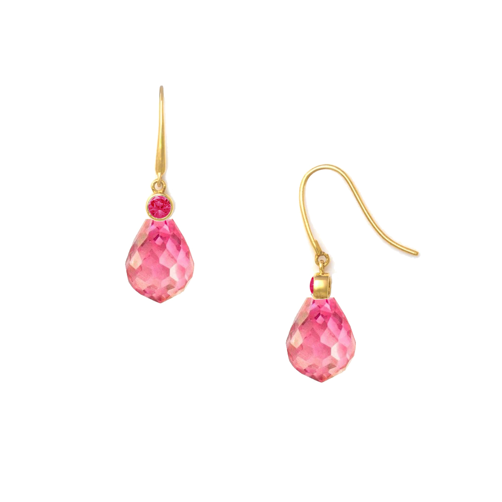 • Ένα υπέροχο ζευγάρι κρεμαστά σκουλαρίκια με εντυπωσιακούς ημιπολύτιμους λίθους Pink Quartz CZ πολυεδρικής κοπής, διαμέτρου 7 x 10 χιλιοστών σε σχήμα Drop (σταγόνα).