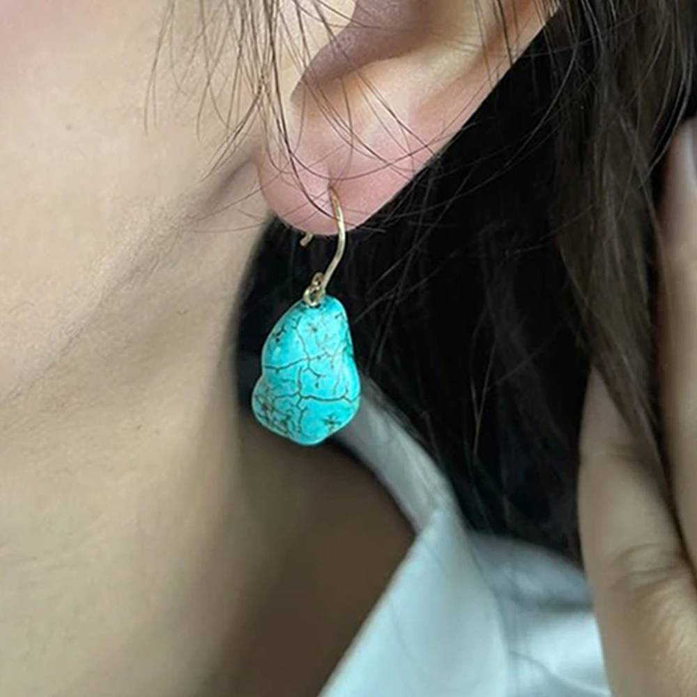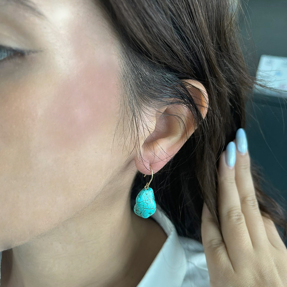 • Ένα υπέροχο κρεμαστό ζευγάρι σκουλαρίκια με ημιπολύτιμο λίθο Tιρκουάζ  ακανόνιστου σχήματος με διάσταση 12 x 19 χιλιοστών.