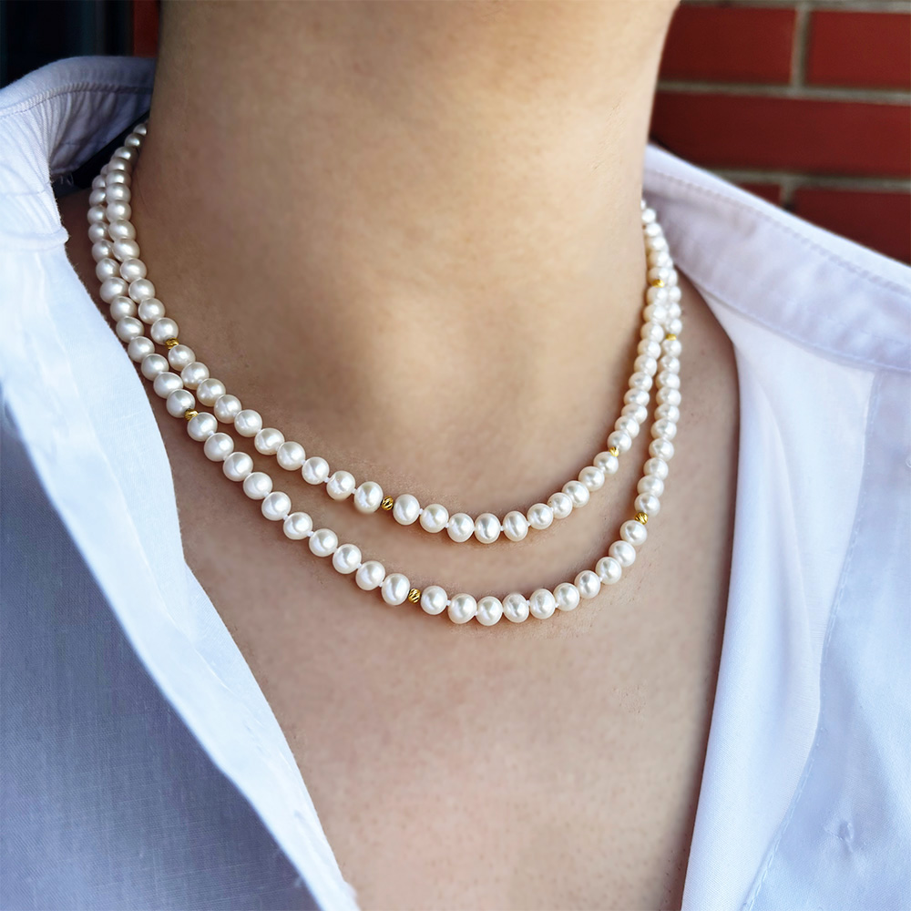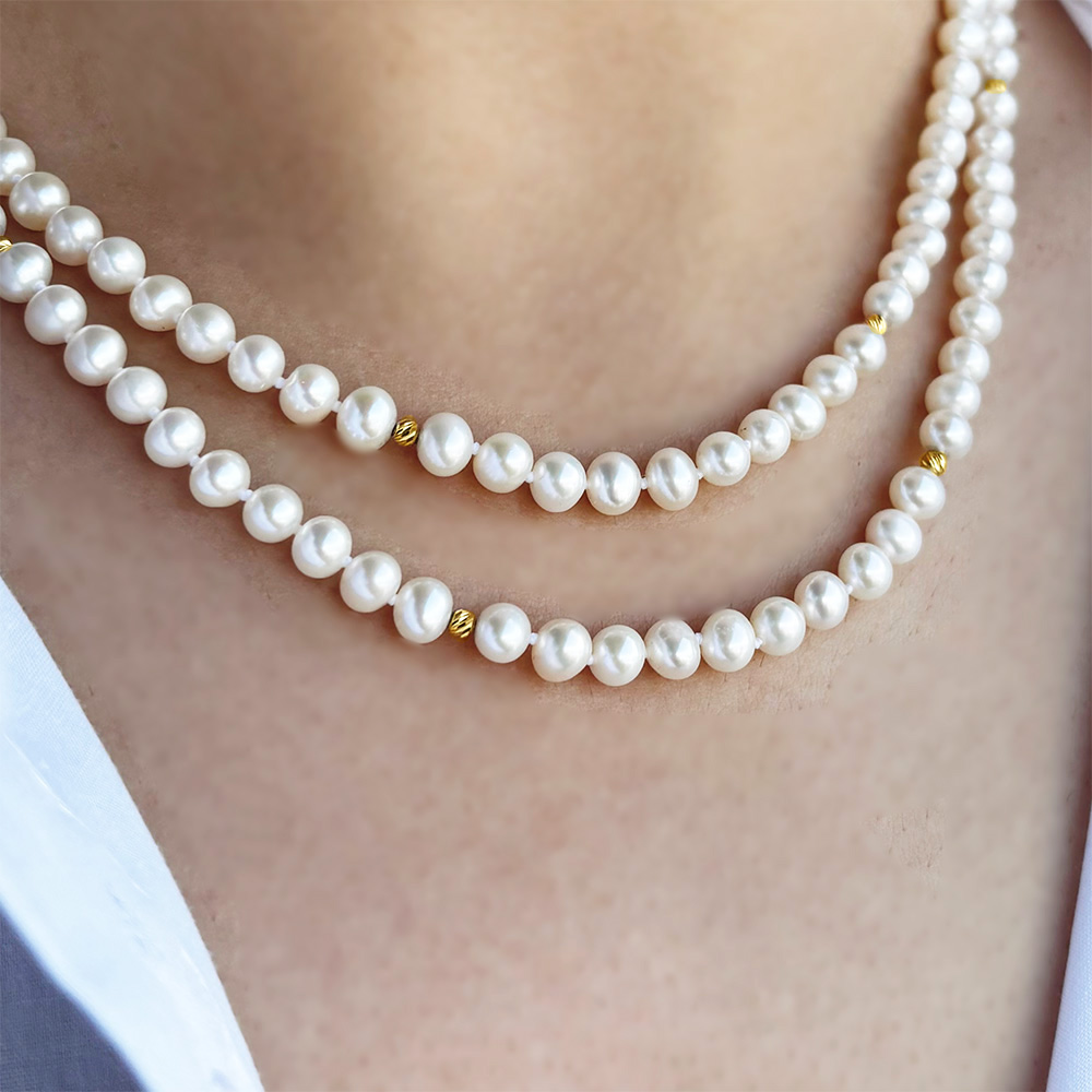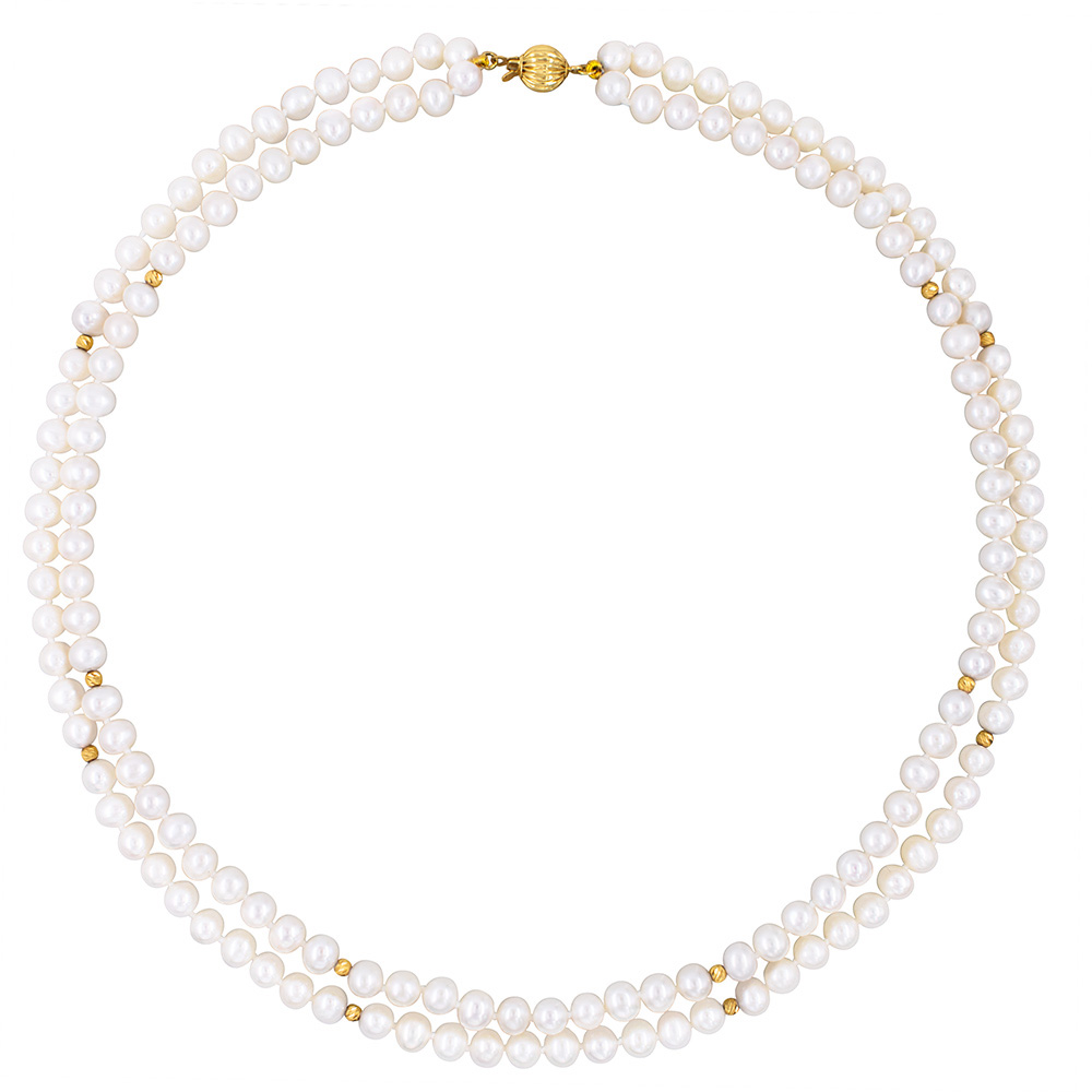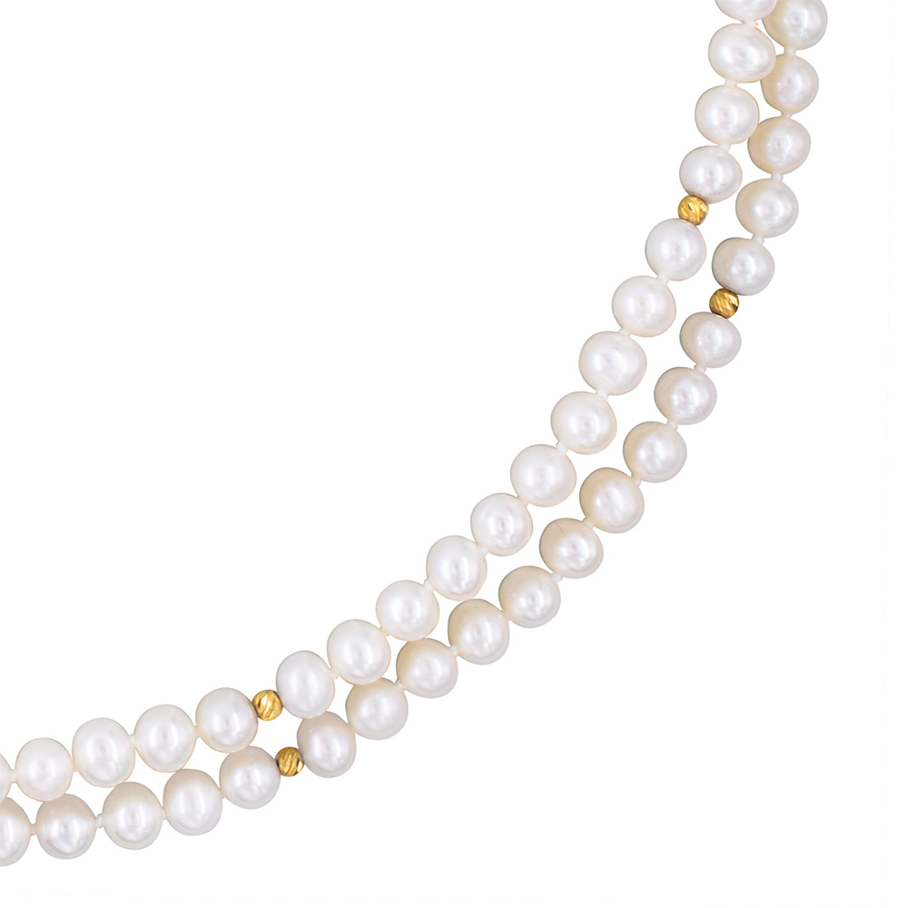 • Ένα υπέροχο κολιέ με 2 σειρές λευκά μαργαριτάρια Fresh Water Pearl διαμέτρου 5-5,5 χιλιοστών.