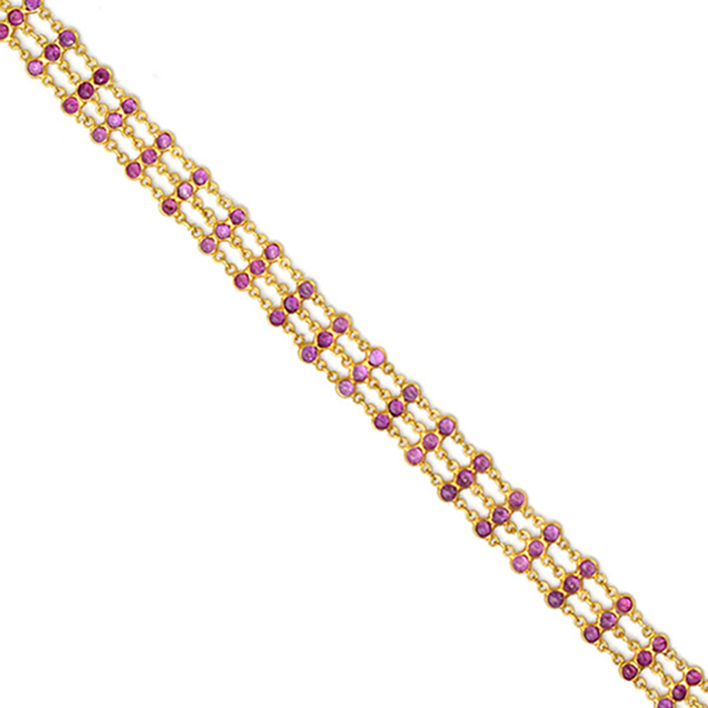• Ένα υπέροχο μοναδικό χειροποίητο πλεκτό βραχιόλι με χρυσό 18 καρατίων που έχει 27 σειρές με 3 ρουμπίνια η καθεμία.