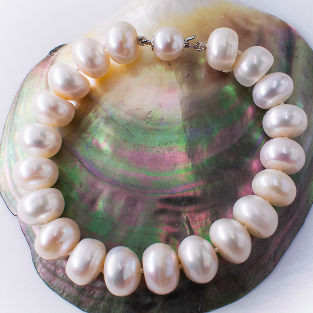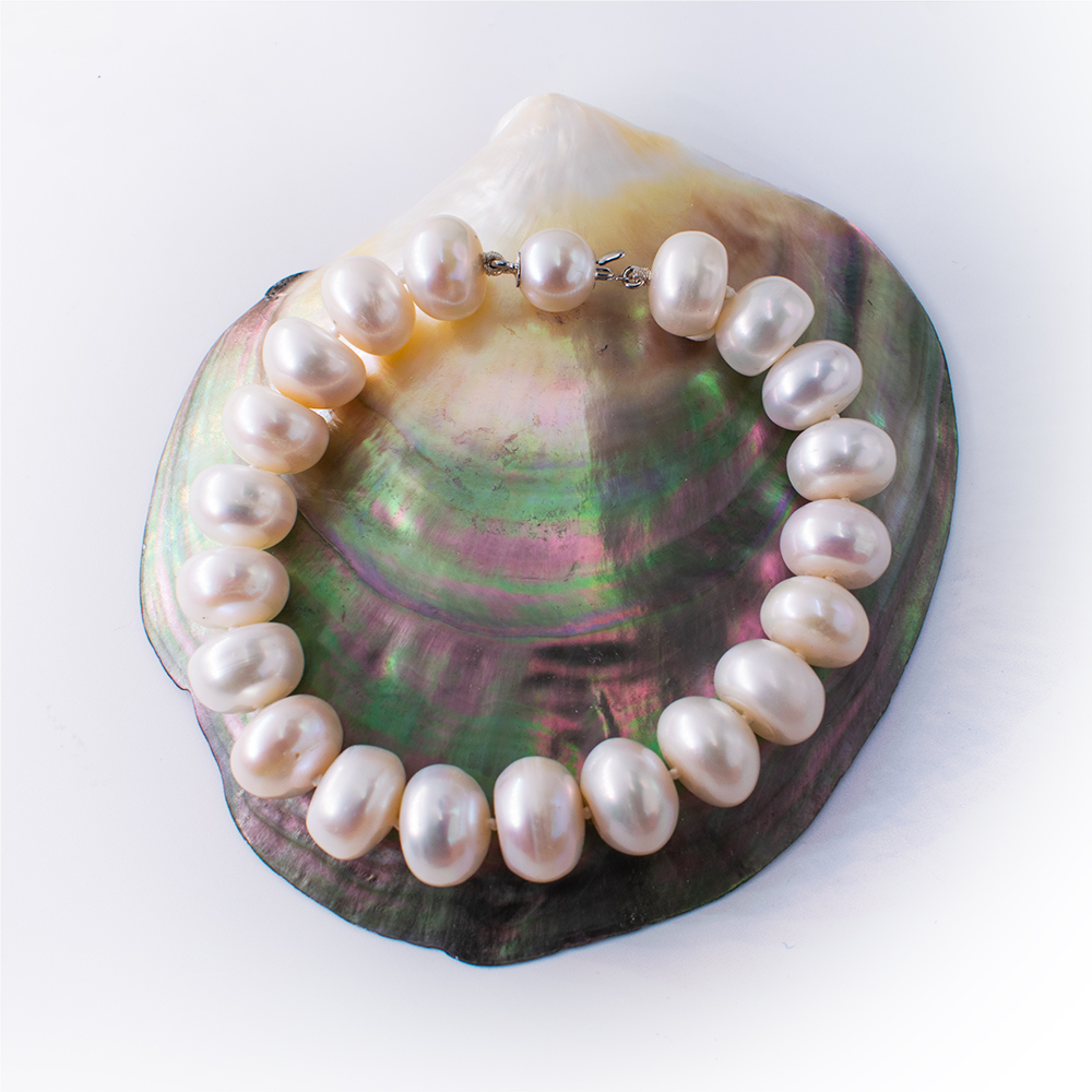 • Ένα υπέροχο βραχιόλι με λευκά μεγάλα μαργαριτάρια Fresh Water Pearl διαμέτρου 8 x 13 χιλιοστών σε σχήμα Center.