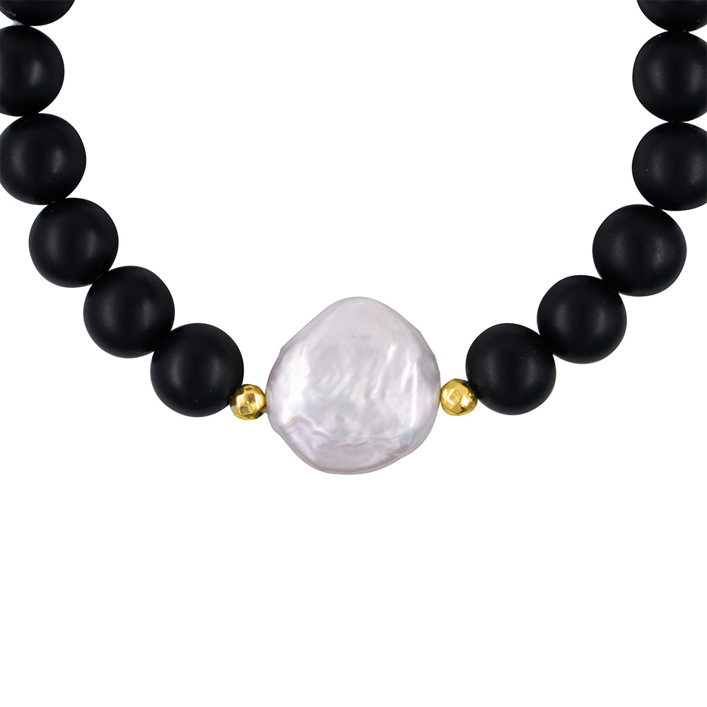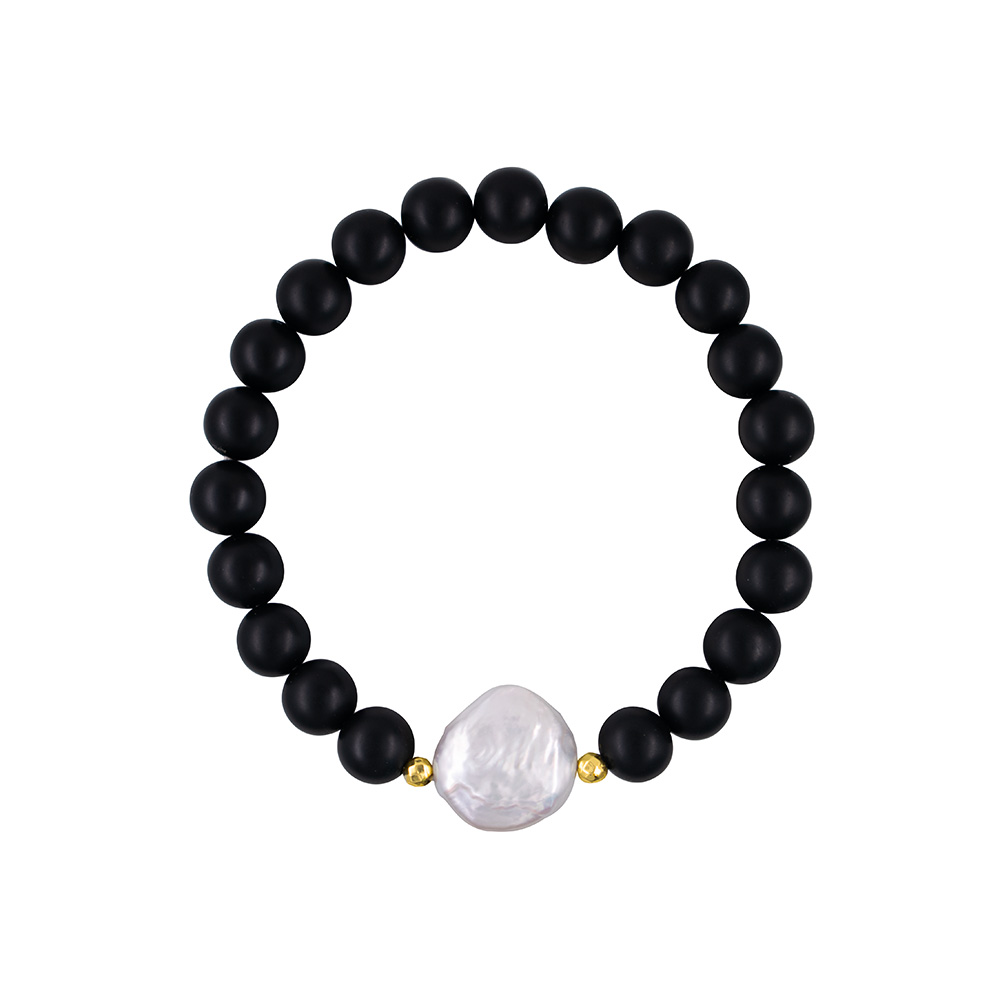 Βραχιόλι με ημιπολύτιμο λίθο black agate, μαργαριτάρι Biwa και αιματίτη χρυσού χρωματισμού - B126339