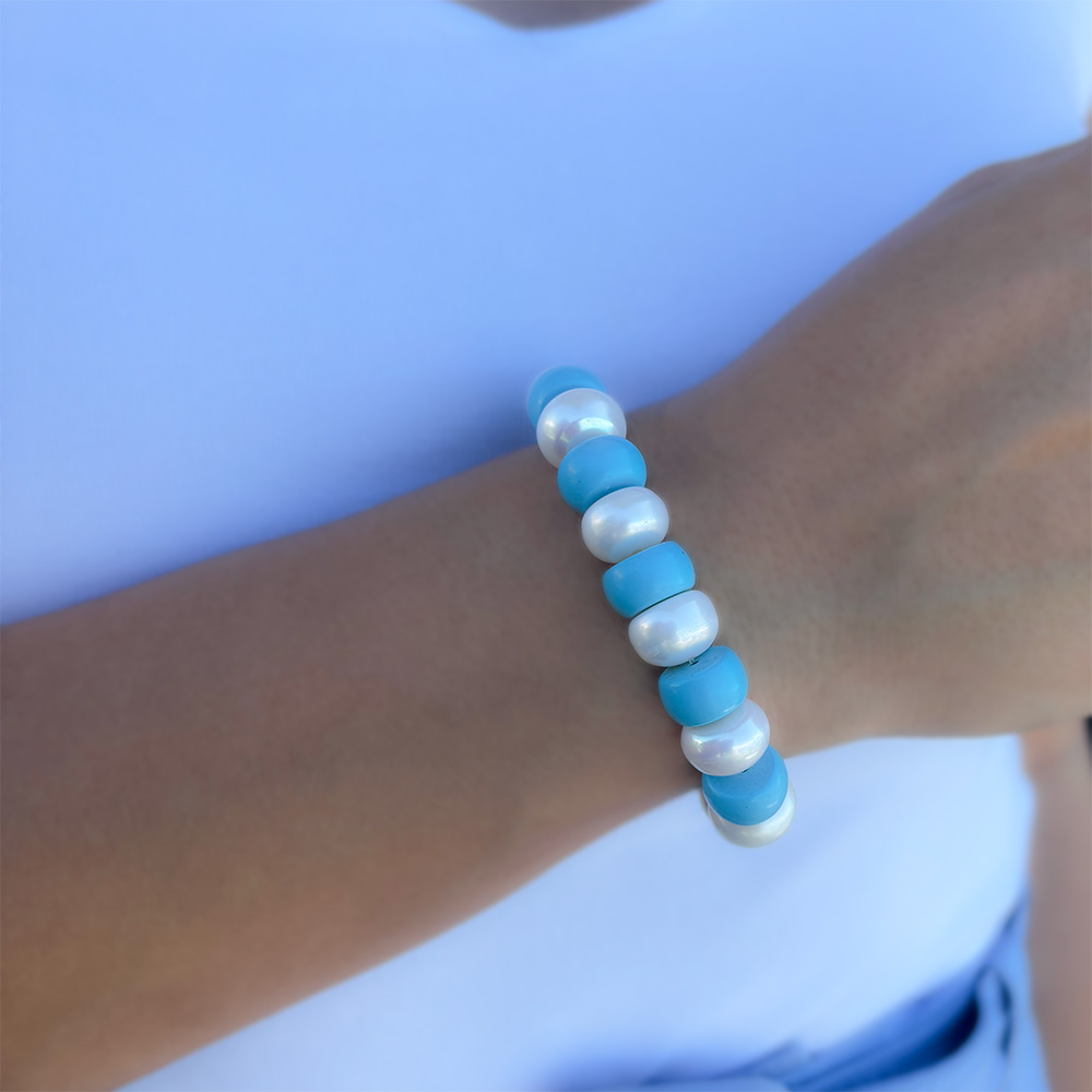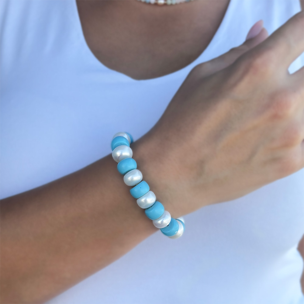 Ενδιάμεσα στα μαργαριτάρια υπάρχουν ημιπολύτιμοι λίθοι τιρκουάζ διαμέτρου 7x13 χιλιοστών ίδιου σχήματος και συνθέτουν ένα πολύ ιδιαίτερο βραχιόλι.