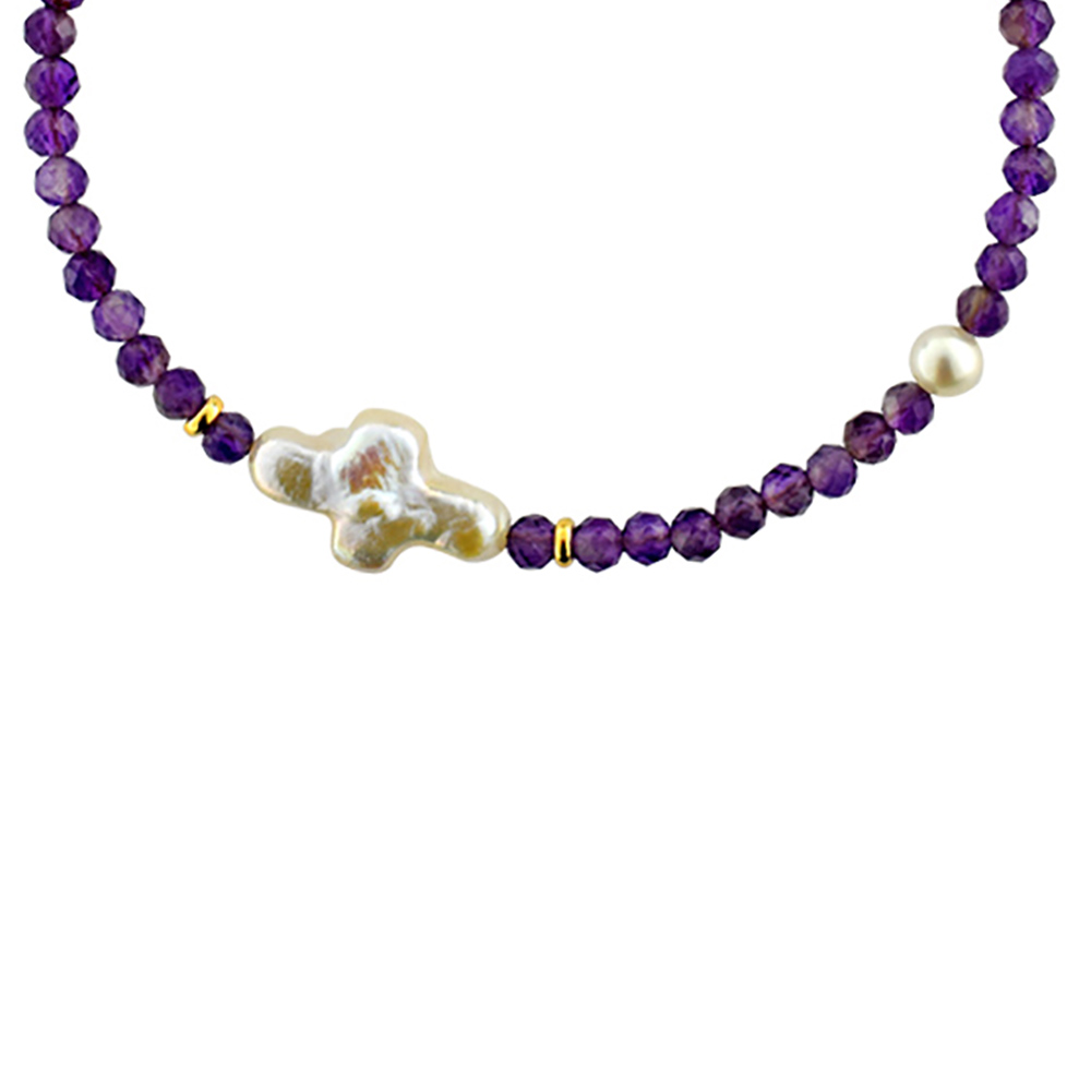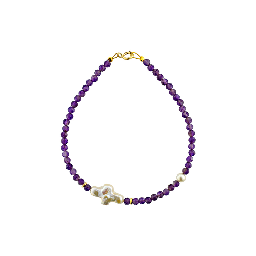 Βραχιόλι Κ14 με χρυσό κούμπωμα, αμέθυστο και μαργαριτάρια - M122895A