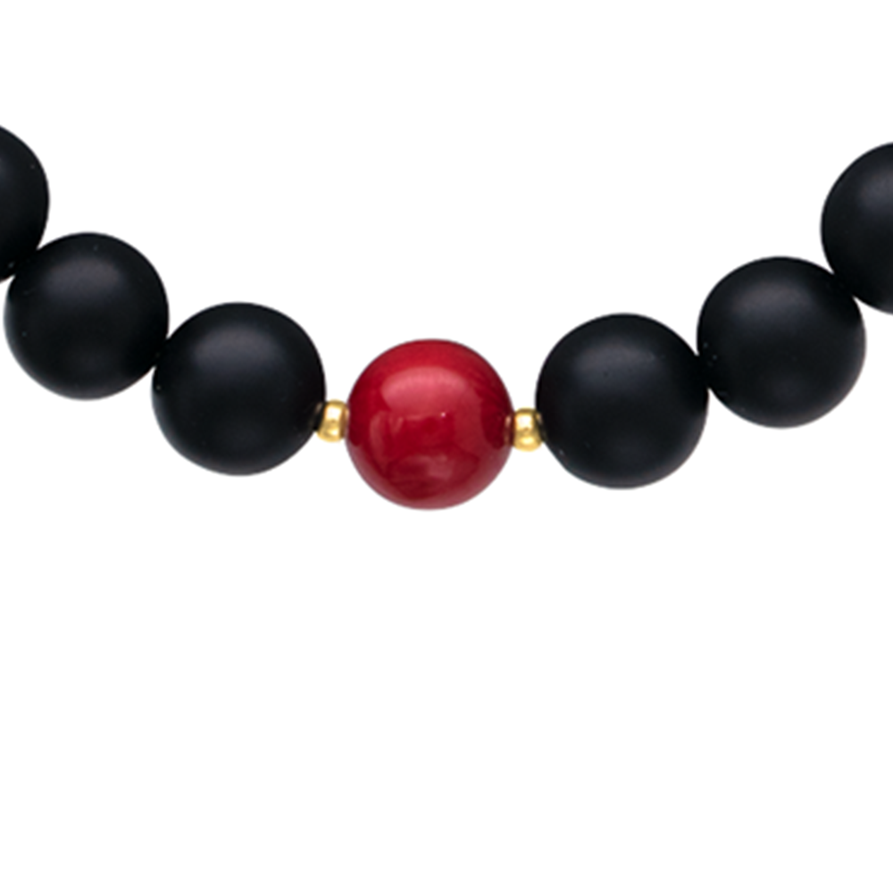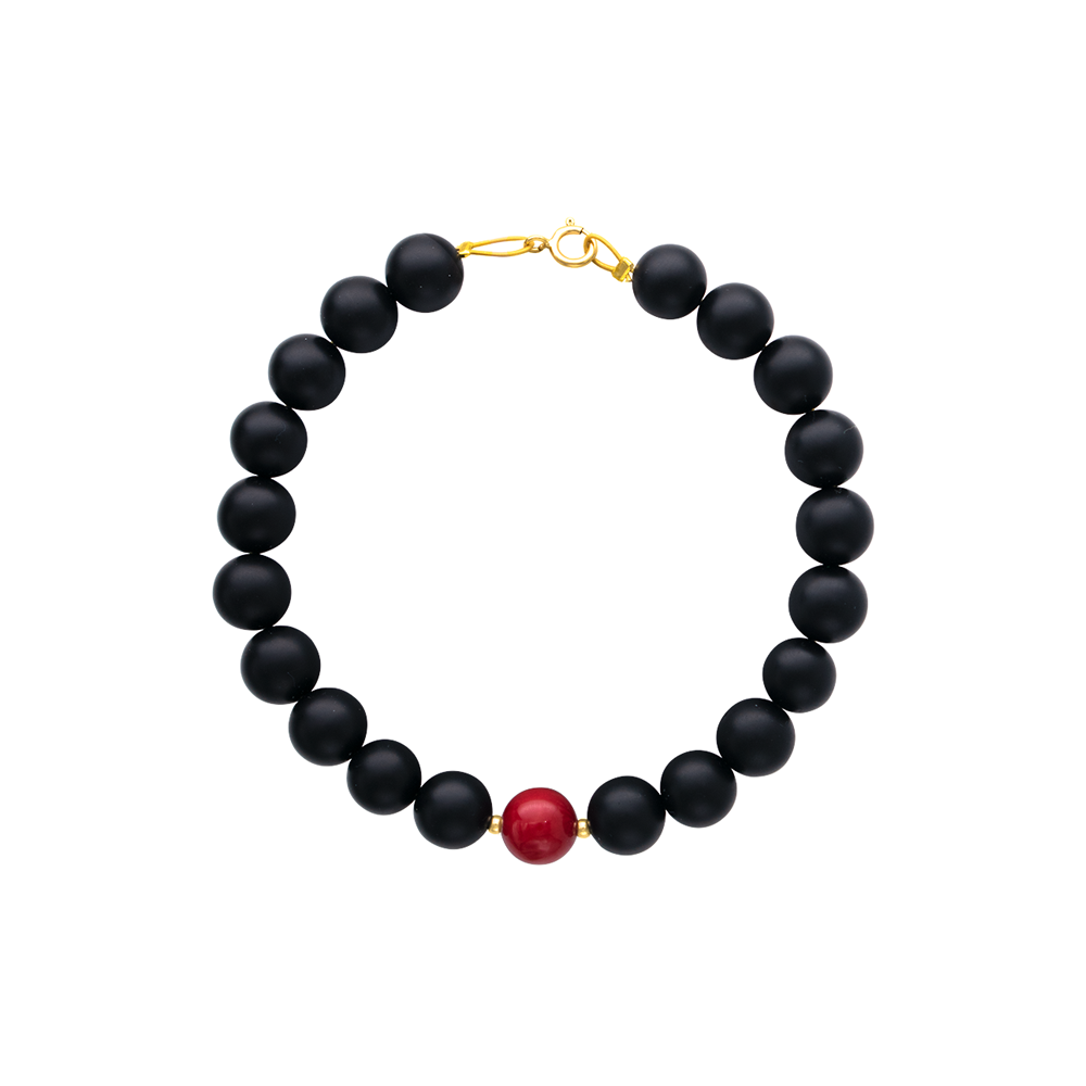 • Ένα εντυπωσιακό βραχιόλι με ημιπολύτιμο λίθο Black Agate διαμέτρου 8 χιλιοστών και στρογγυλό κοράλλι διαμέτρου 8 χιλιοστών.